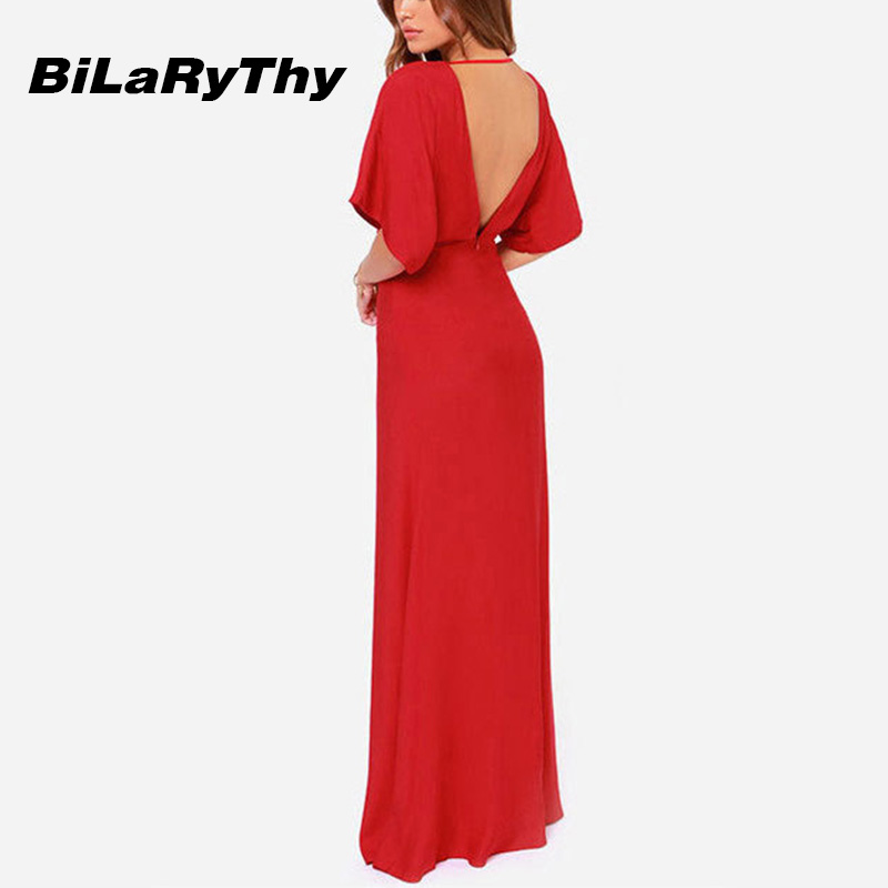 BiLaRyThy Elegant Sexy Occasion Red Backless Maxi Dresses O Neck Short Sleeve Floor Length Long Chiffon Dress for Summer