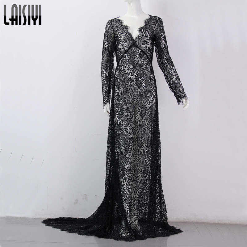 LAISIYI Women Sexy Dresses Autumn Floor-Length Black White Lace Dress Adjust Waist See Through Floral Vestido transparent DR5046USD 9.12-10.78/piece