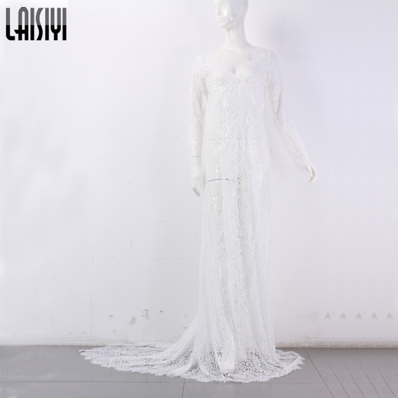 LAISIYI 2017 Sexy Lace Long Dress V-neck Long Sleeve Backless Maxi Dresses Summer Vestidos Plus Size Black White ASDR20034