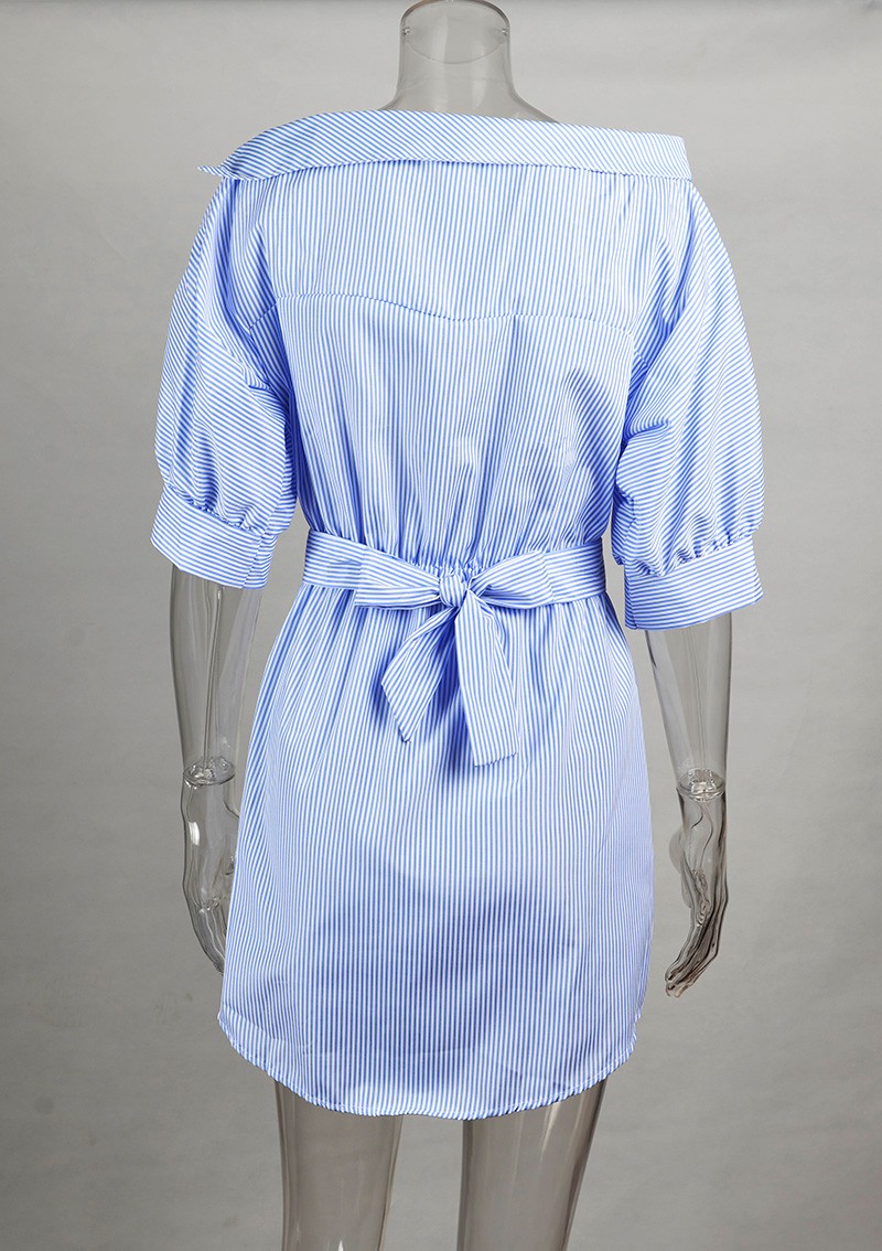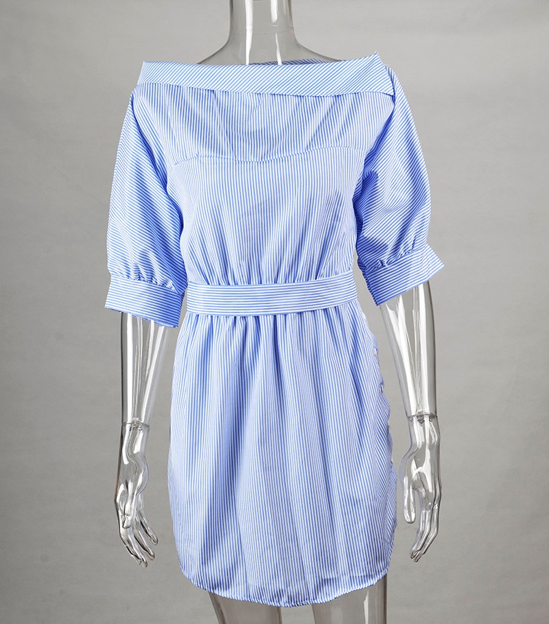 2017 Fashion one shoulder Blue striped women dress shirt Sexy side split Elegant half sleeve waistband OL girls  beach dresses