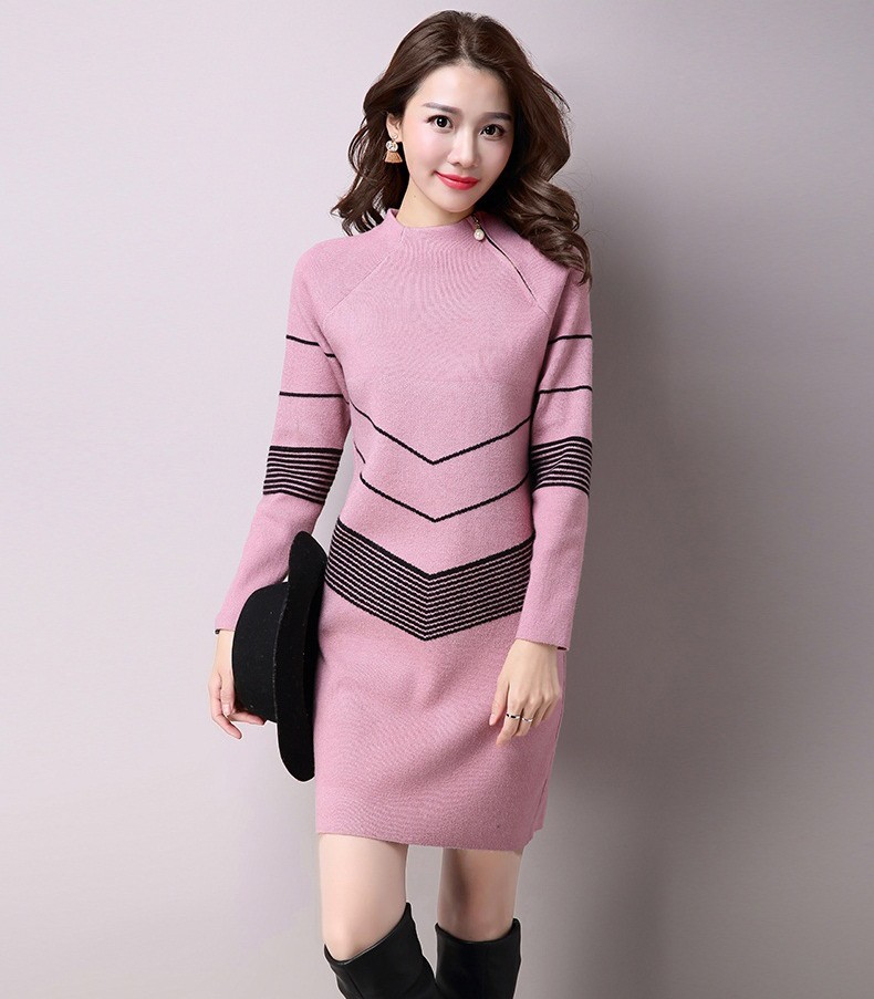 2016 Korean Style Knitted Women Sweater Dress Sweter Mujer Striped Half Turtleneck Long Sleeve Mini Women Sweater