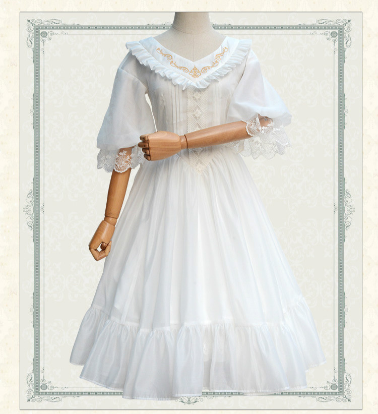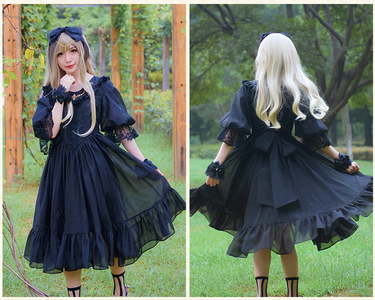 2017 New Classic Lolita Dress Sweet V Neck Embroidered Half Sleeve Chiffon Dress for Women Black/White