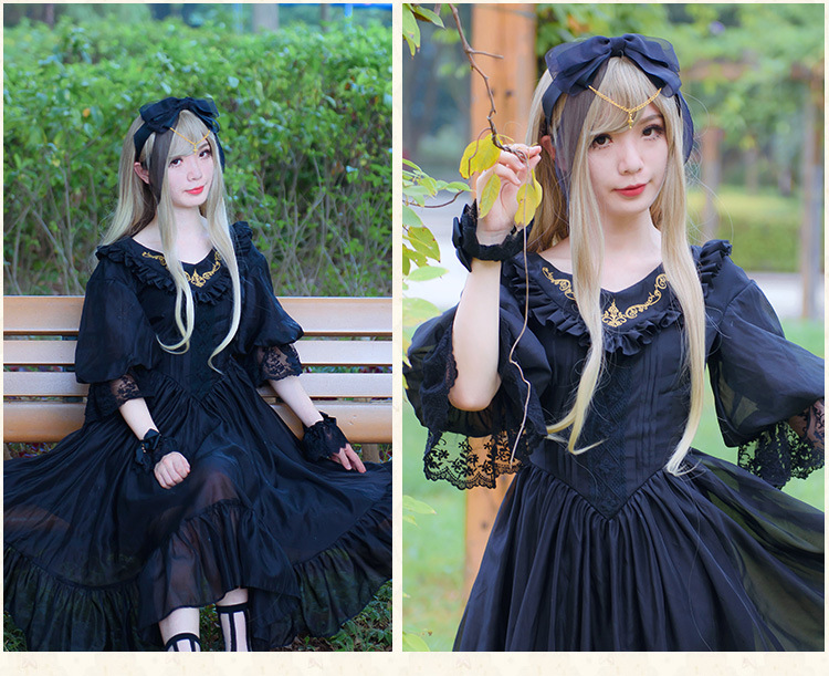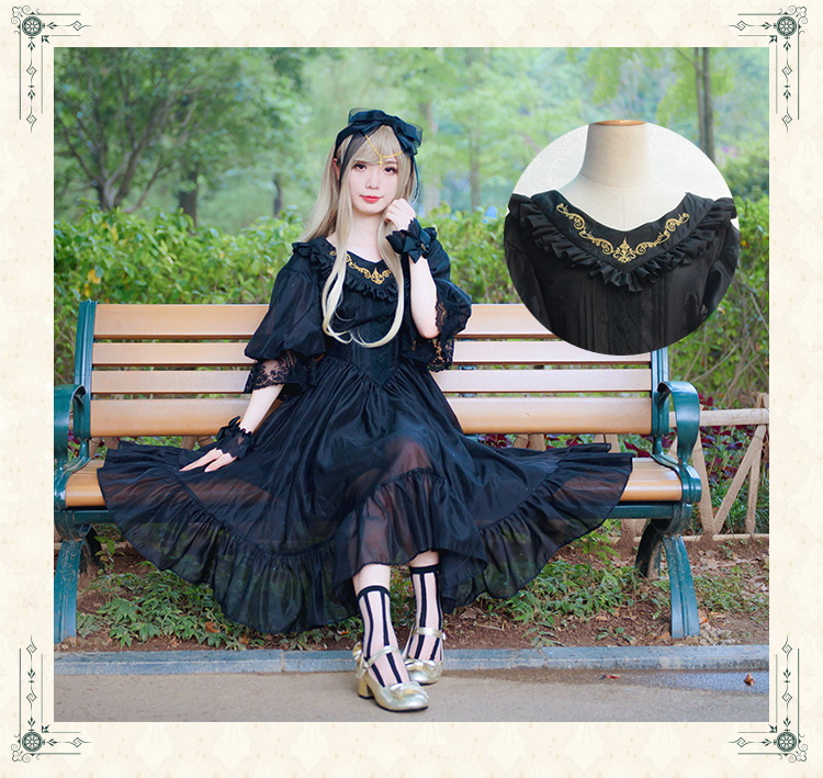 2016 New Classic Lolita Dress Sweet V Neck Embroidered Half Sleeve Chiffon Dress for Women Black/White