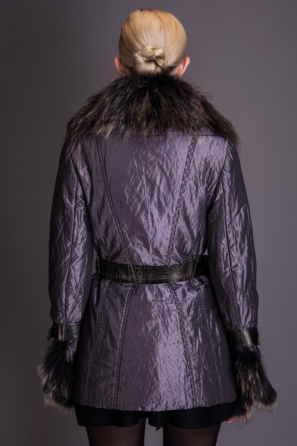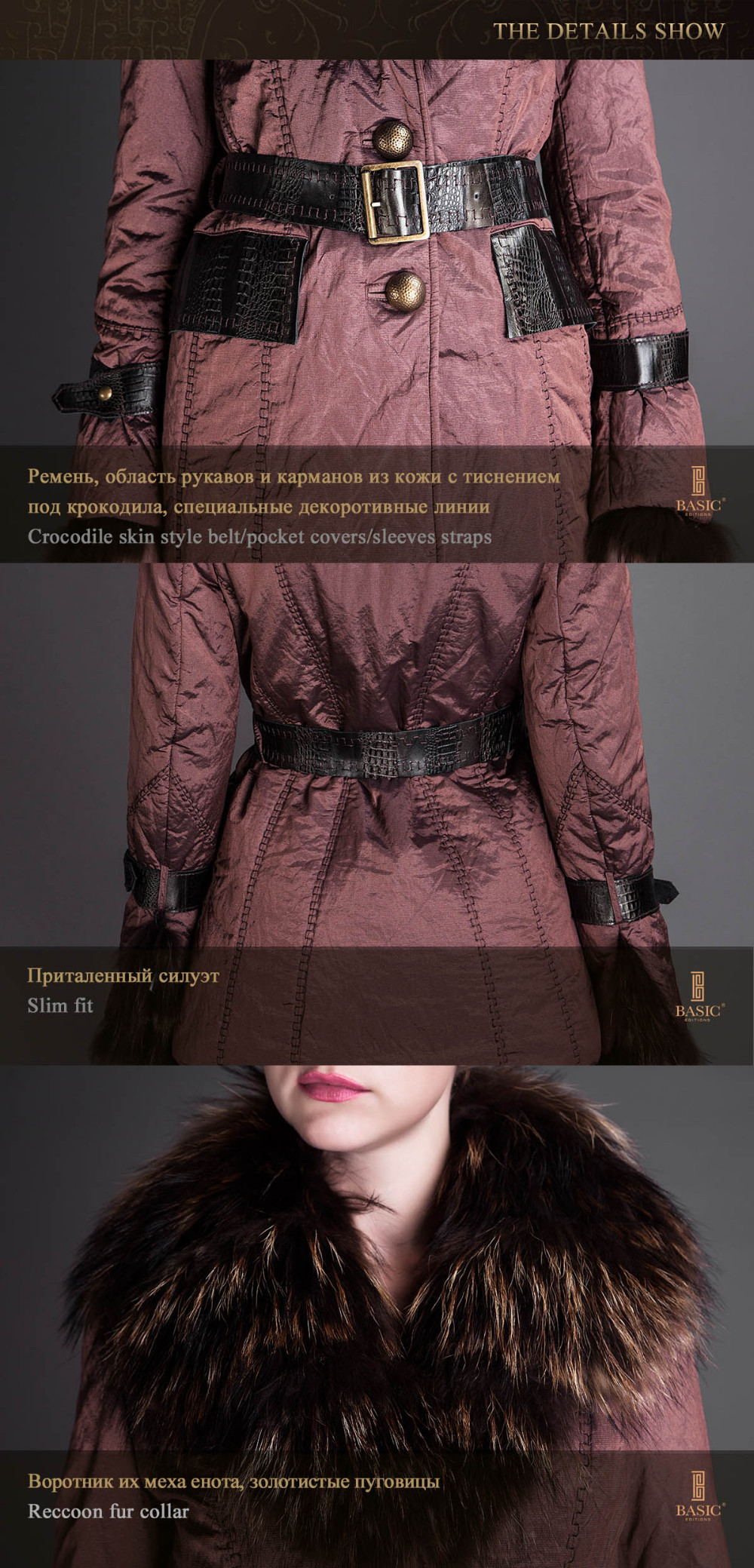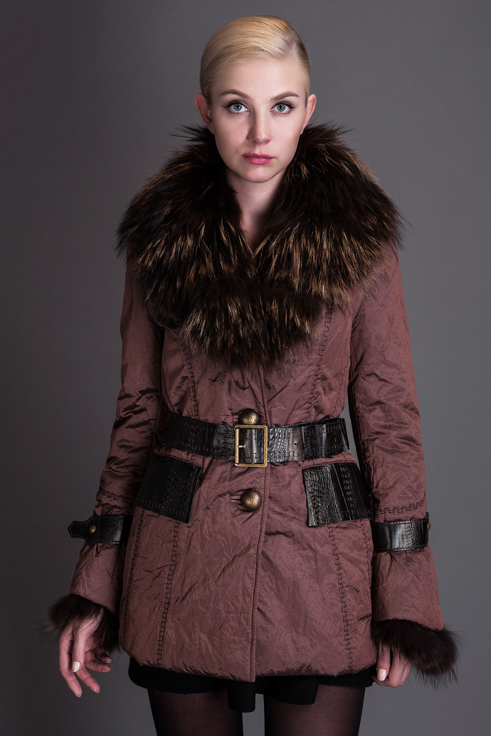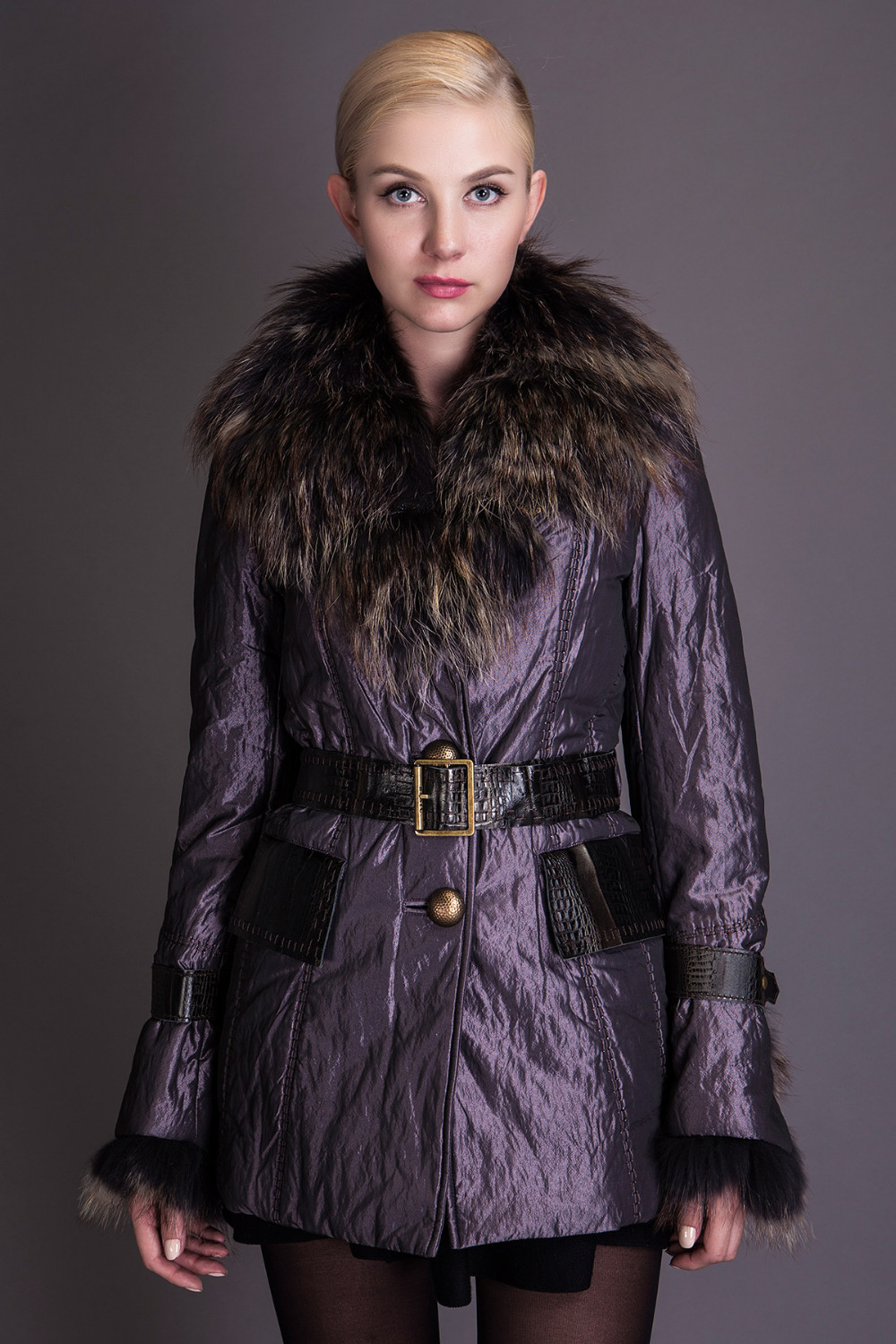 Basic Editions Autumn Fall Metallic Silk Fabric Cotton Coat Jacket with Raccoon Fur Collar and Belt - S050