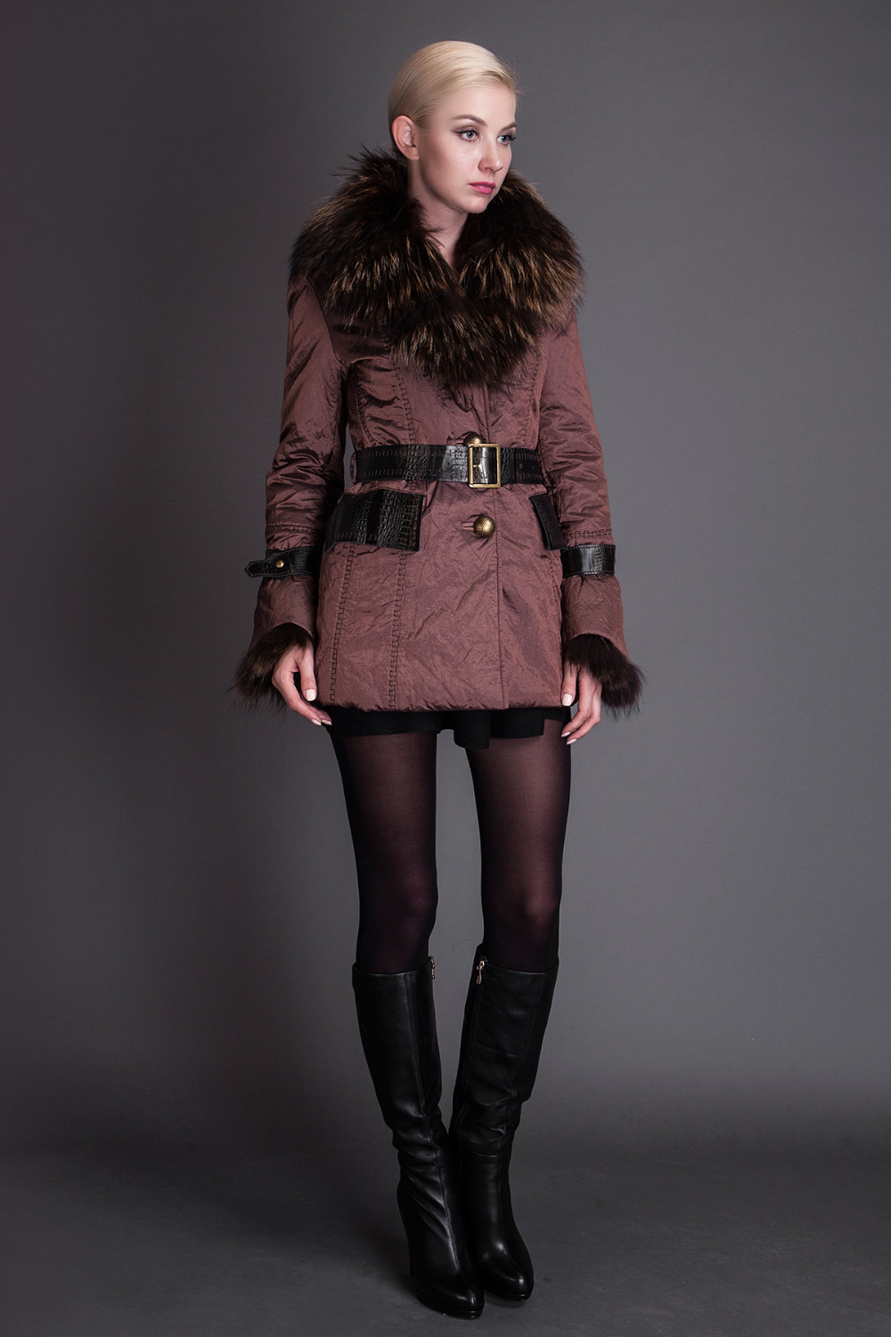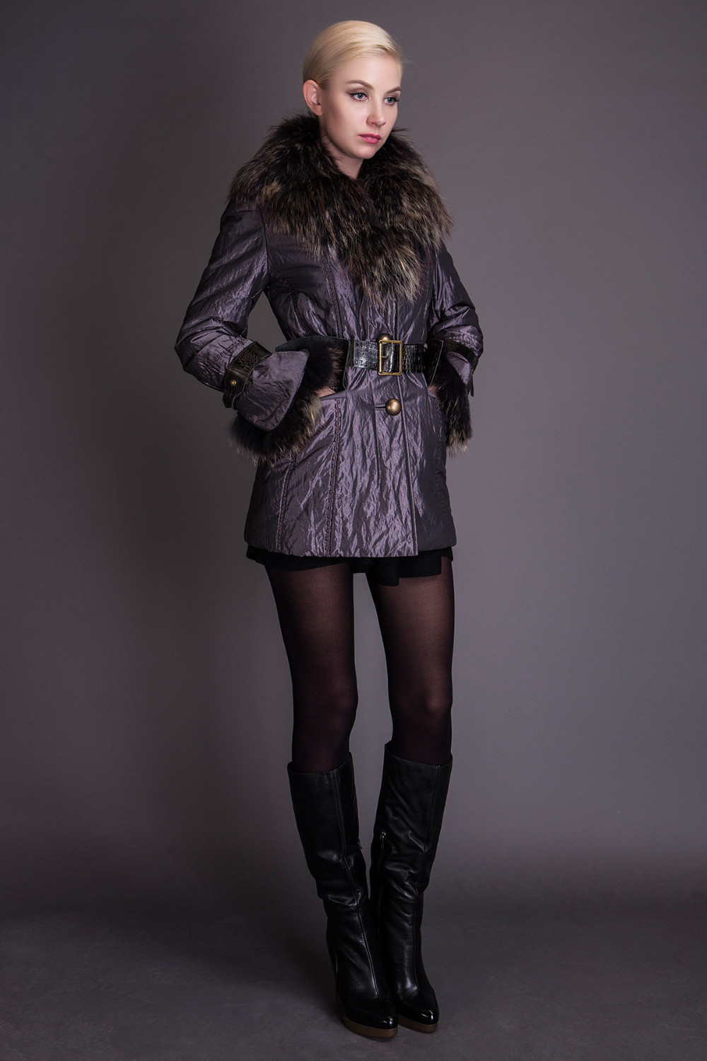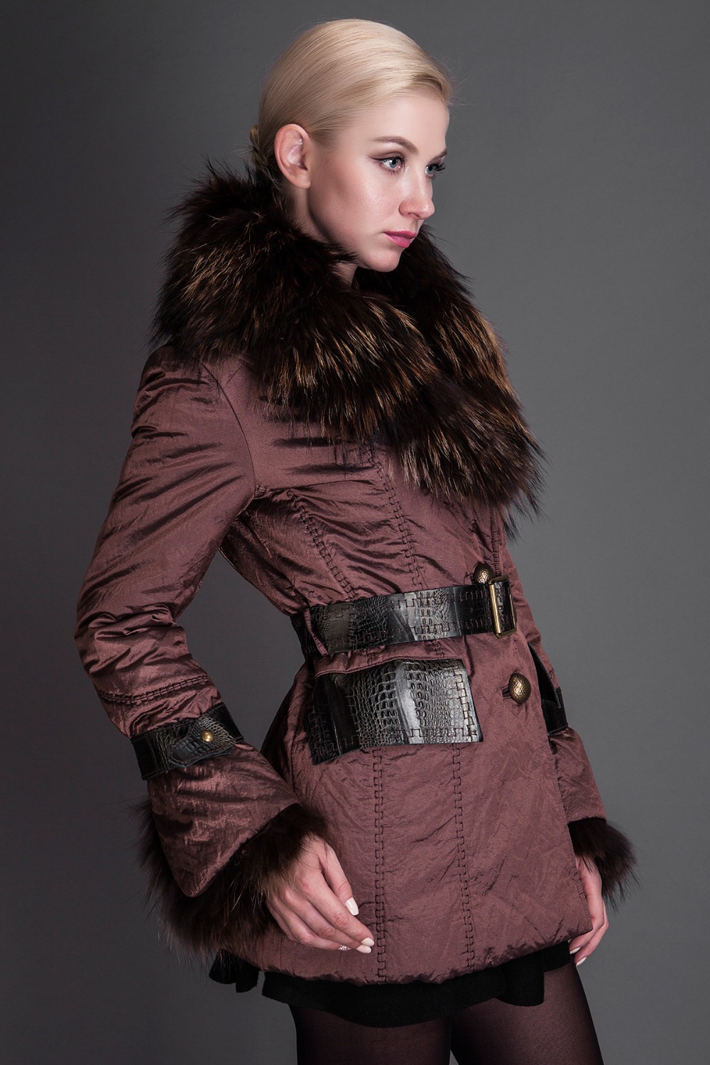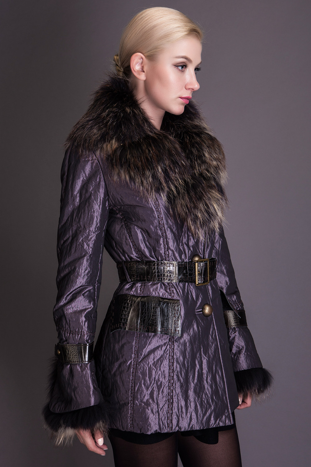 Basic Editions Autumn Fall Metallic Silk Fabric Cotton Coat Jacket with Raccoon Fur Collar and Belt - S050