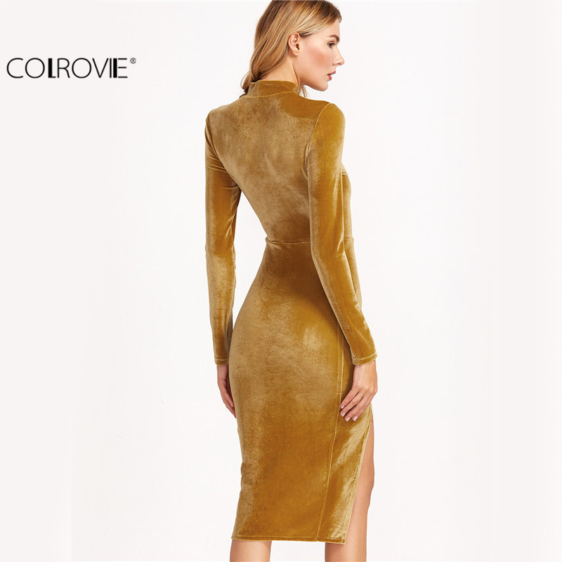 COLROVIE Women Office Dresses Korean Women Clothing Work Dress Mustard Mock Neck Split Side Velvet Sheath Dress