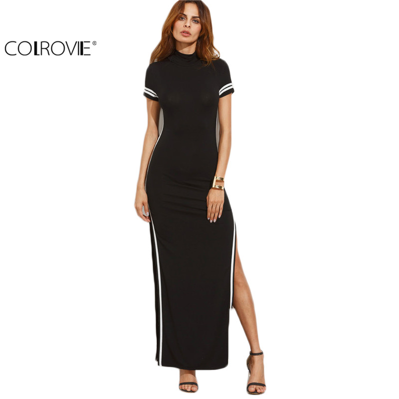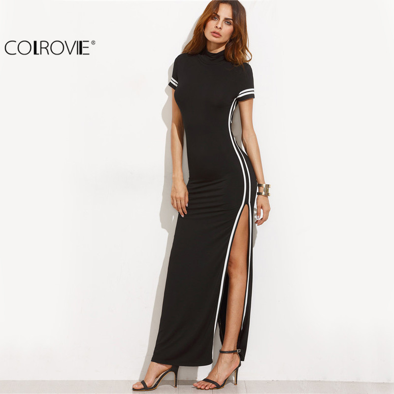 COLROVIE Women Sexy Wear Autumn Style Bodycon Dresses Black Cut Out Striped Trim Short Sleeve High Neck Split Sheath Maxi Dress
