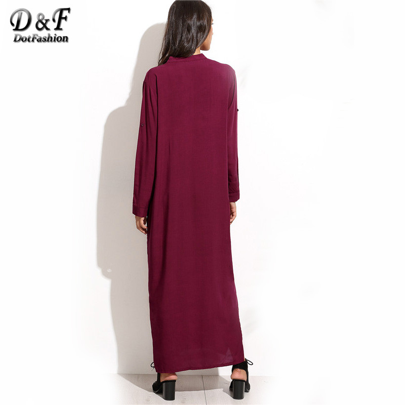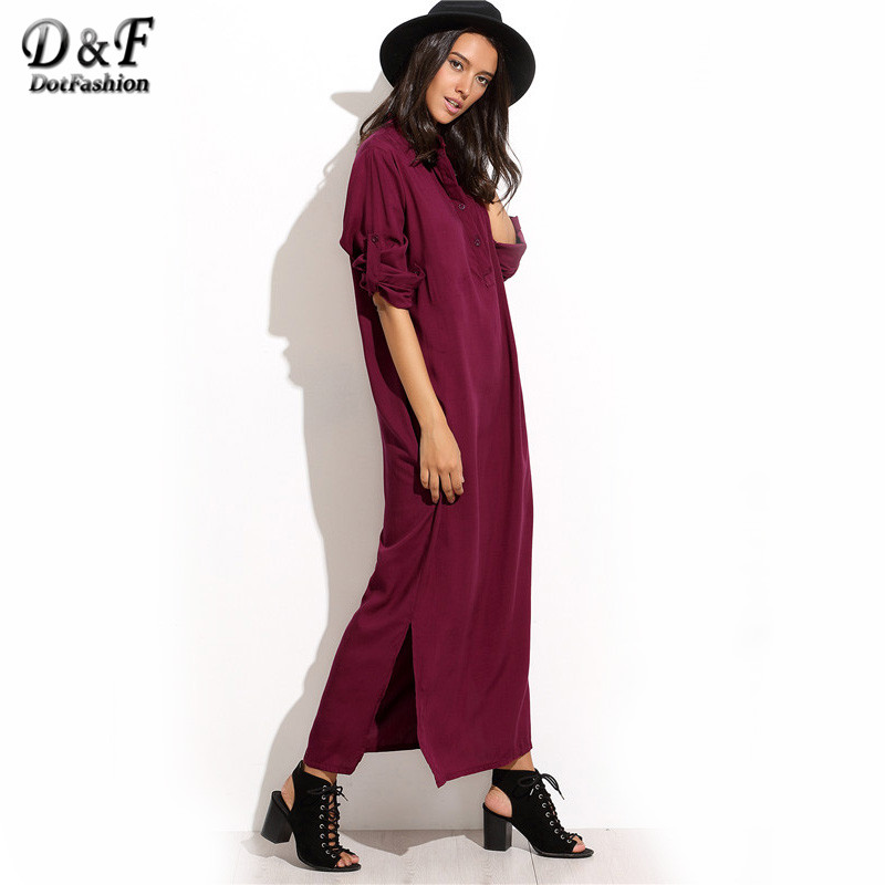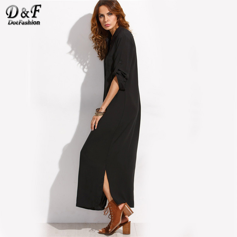 Dotfashion Plain Split Side Shirt Dress Ladies Autumn Maxi Dresses Plain Long Sleeve Stand Collar Buttons Dress