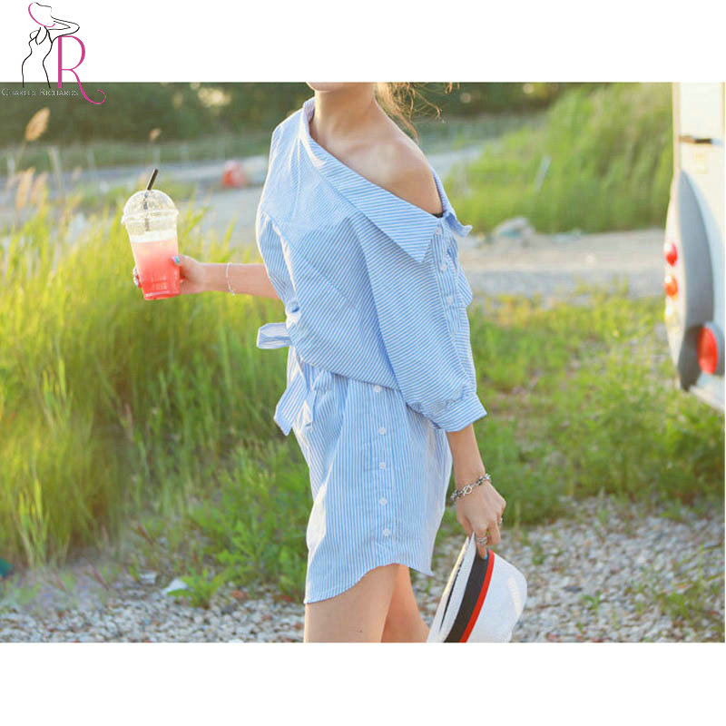 Dress-2017-Women-Clothes-Half-Sleeve-Blue-Stripes-Off-the-Shoulder-Loose-Casual-Tie-Waist-Button-Sid-32390408338