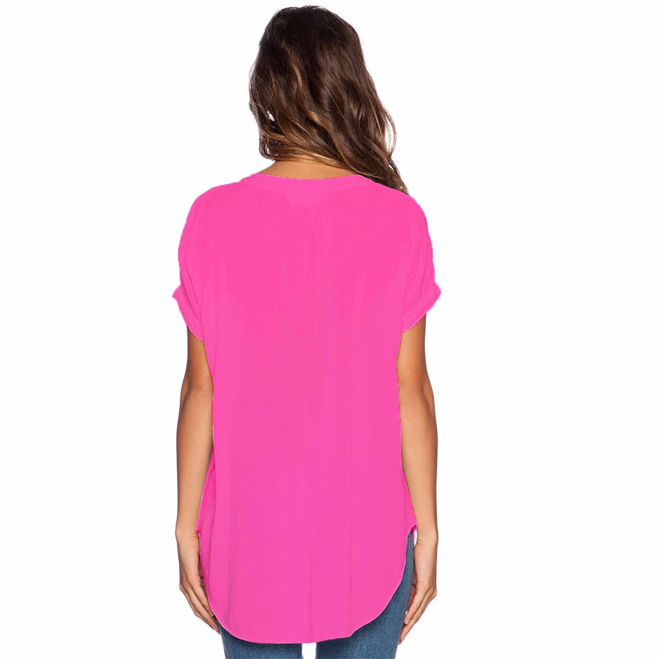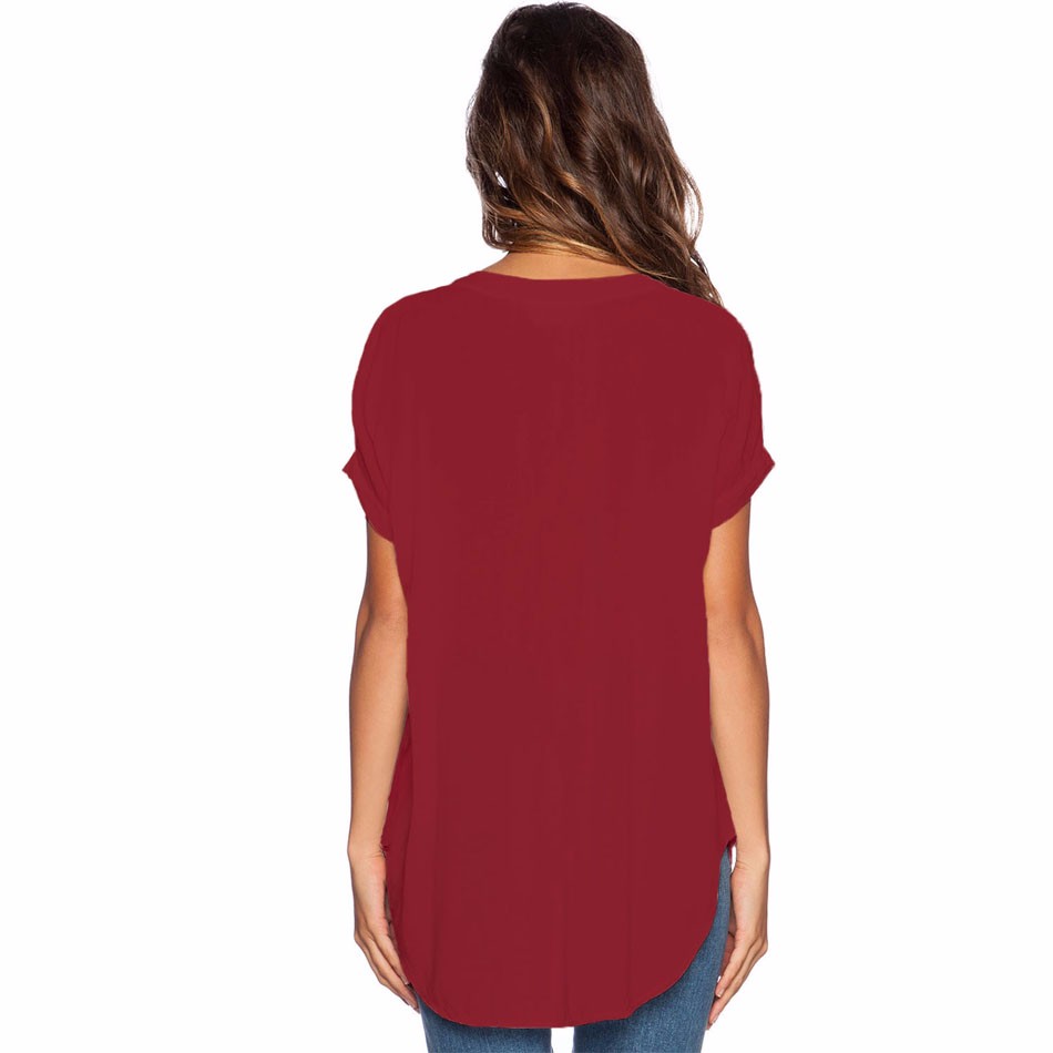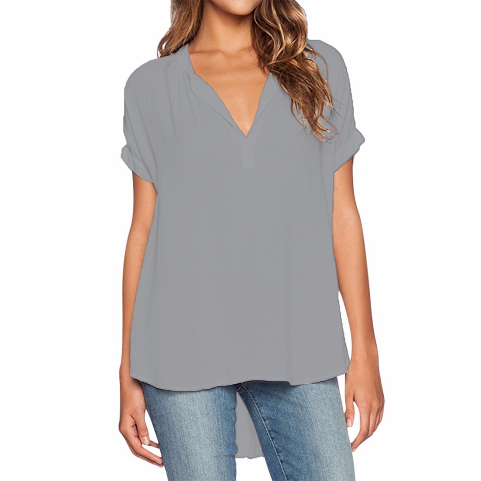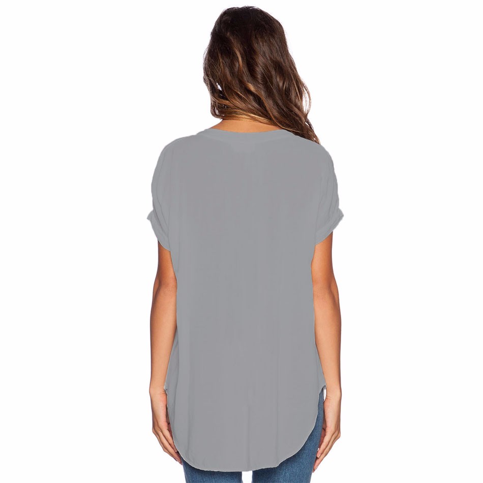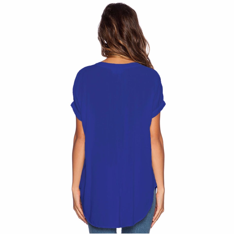 For the girl who\'s so on top of trends it\'s astounding, we see the V-sionary blouse top in your future! In a very popular color, this lightweight top pairs a silky woven material with exquisitely cuffed short sleeves, a deep V-neckline, and a rounded hemline. Loose fitted and slightly sheer. Well received by modern women for most occasions from office work to daily life.