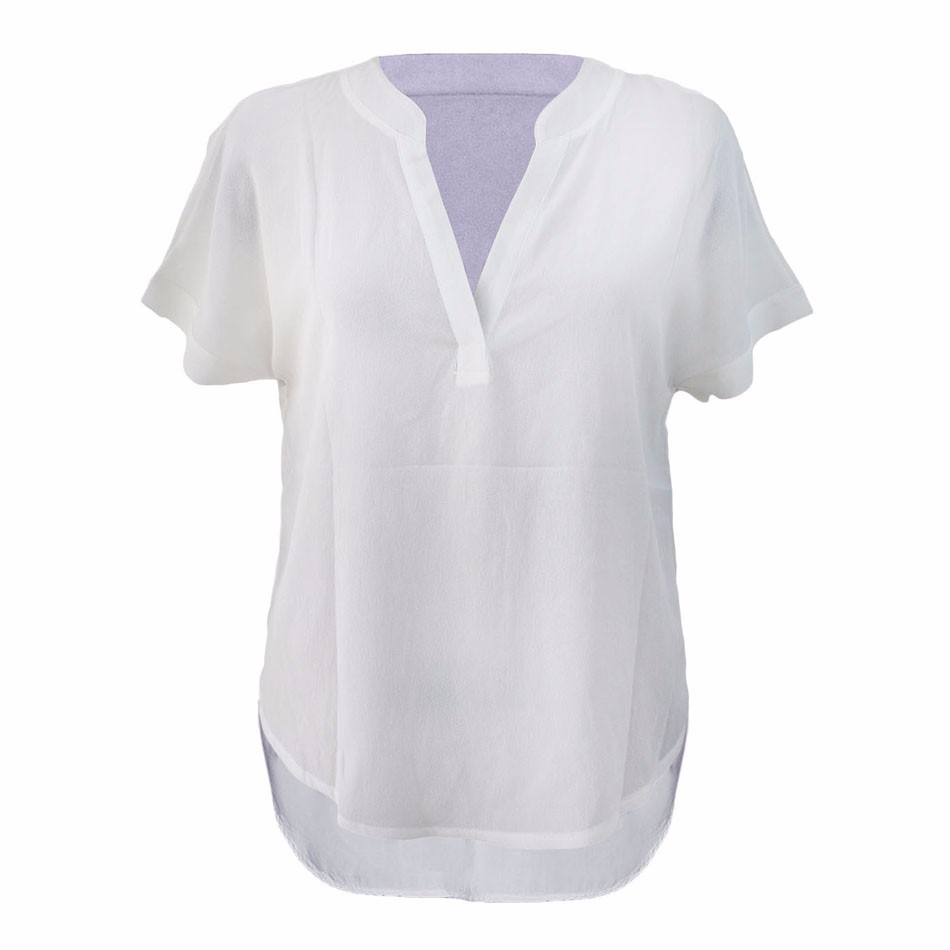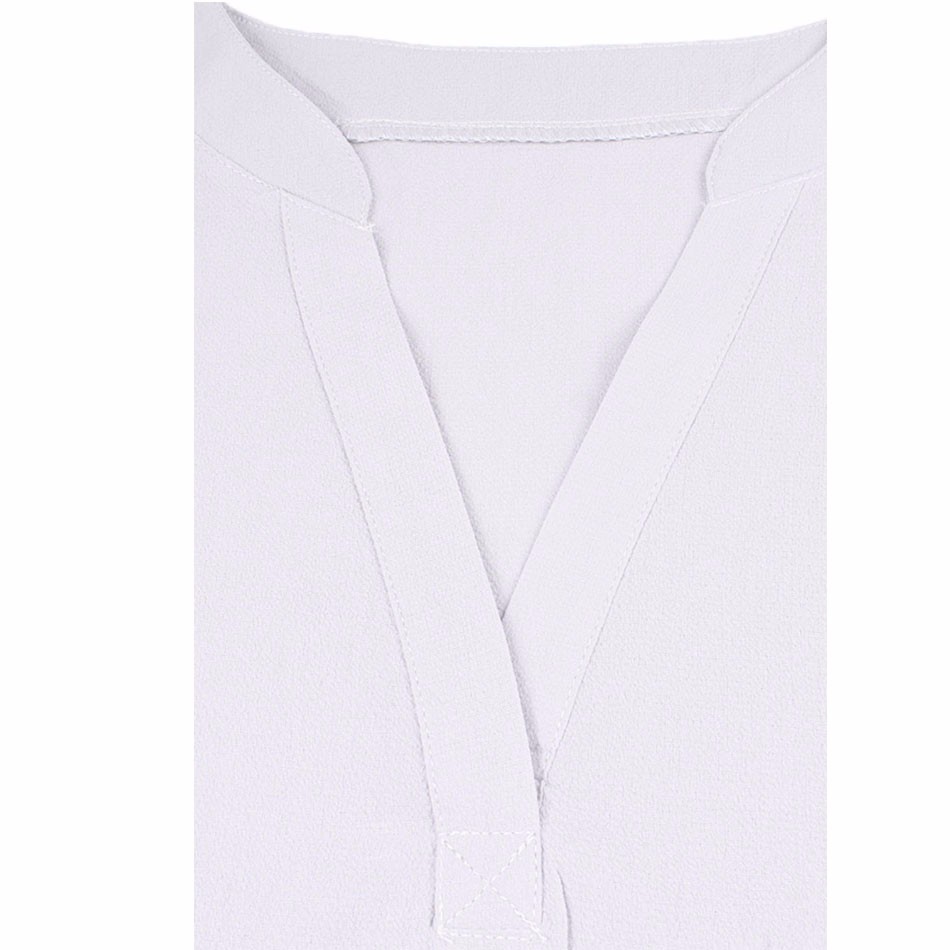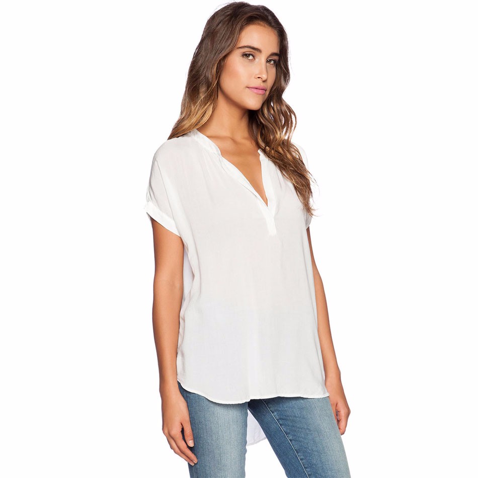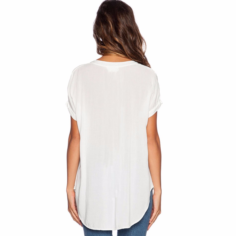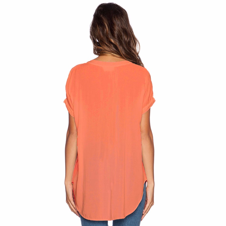 For the girl who\'s so on top of trends it\'s astounding, we see the V-sionary blouse top in your future! In a very popular color, this lightweight top pairs a silky woven material with exquisitely cuffed short sleeves, a deep V-neckline, and a rounded hemline. Loose fitted and slightly sheer. Well received by modern women for most occasions from office work to daily life.