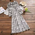 Mori Girl Autumn Spring Midi Women Dress Sweet Round Neck Plaid Cotton Linen Femme Robe Vestidos Long Sleeve Casual Loose Dress