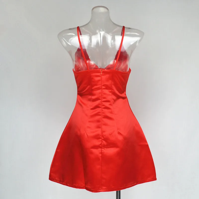 Glisten under the hot summer sun in this red stunner! A gorgeous red satin dresss with a structured bustier bodice, defined waist and box-pleated flare skirt. . deep v neck, Concealed zip closure at back .
