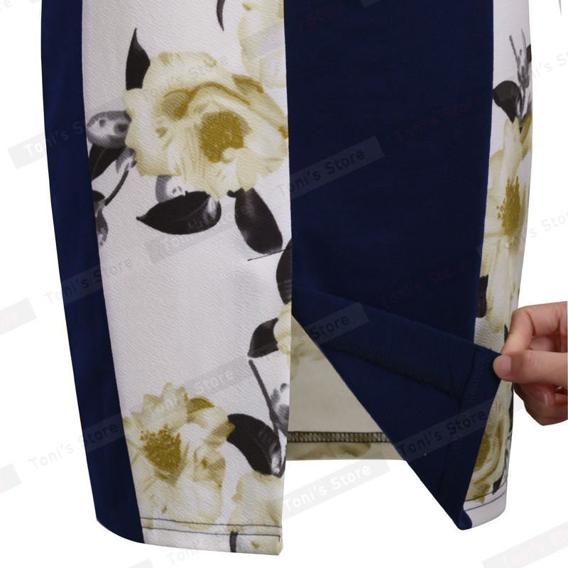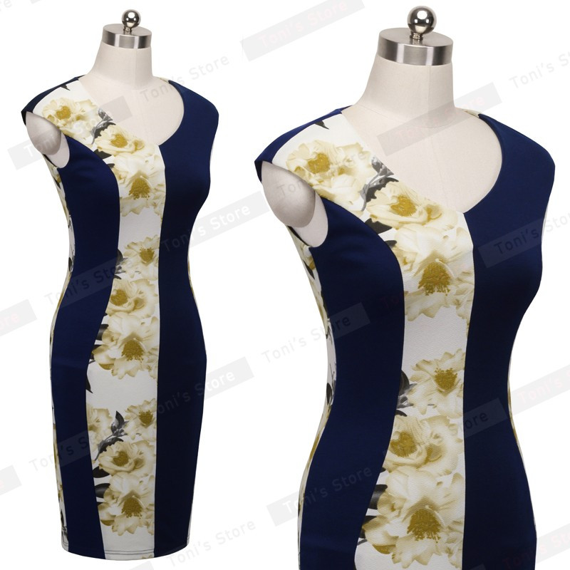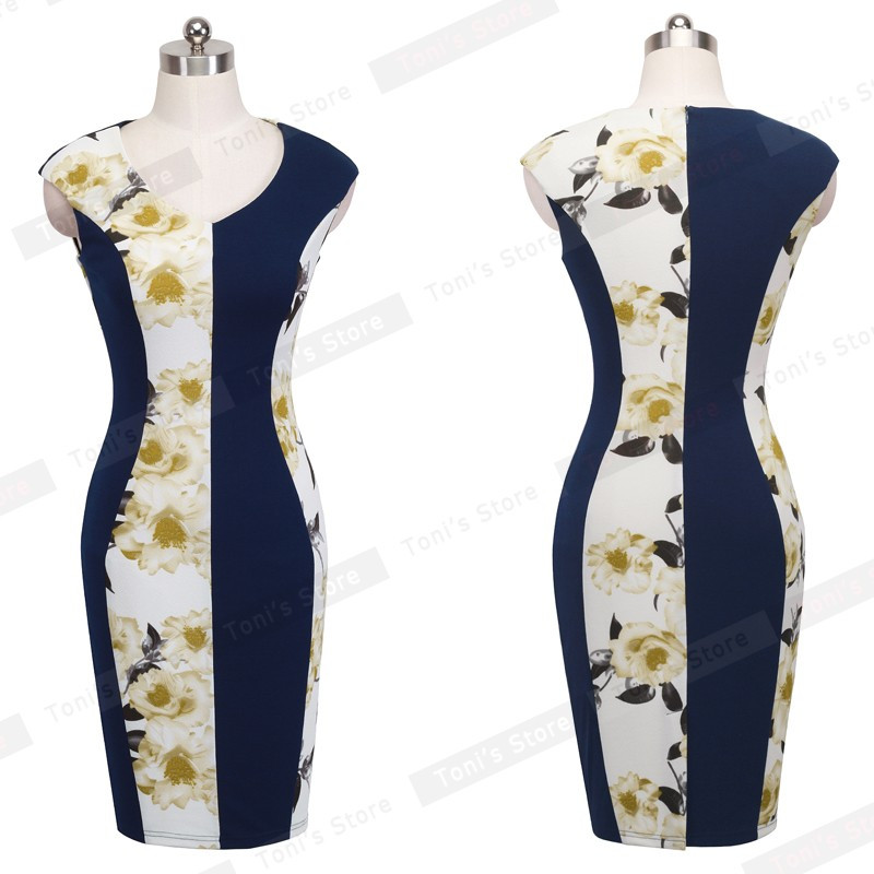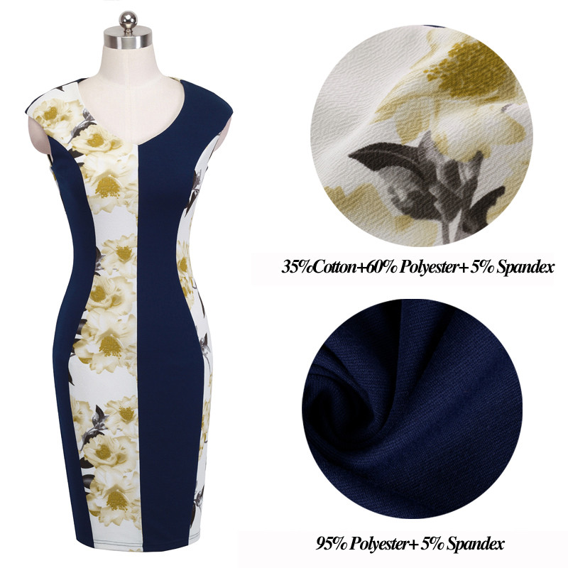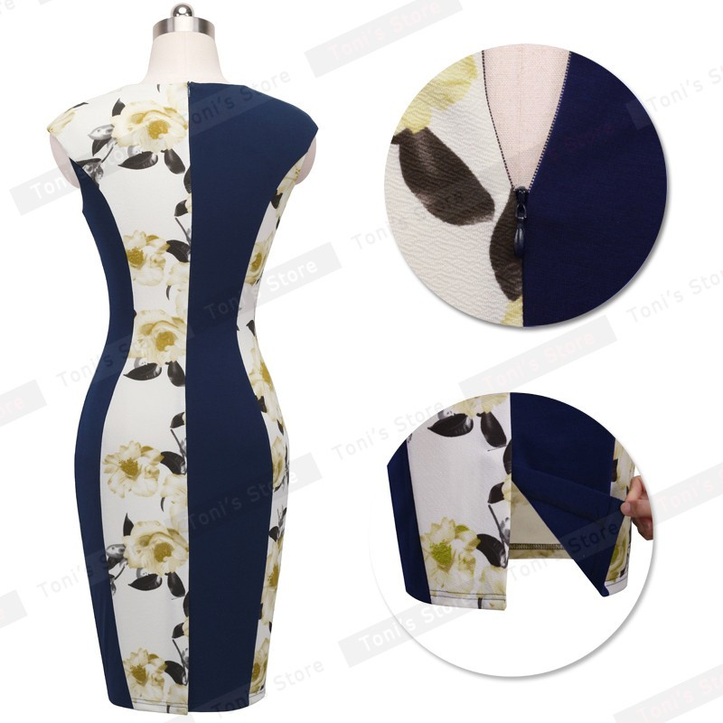 Nice-forever New V-neck Print Floral Patchwork White Elegant Casual Work Sleeveless Tunic Bodycon Spring office Dress b280