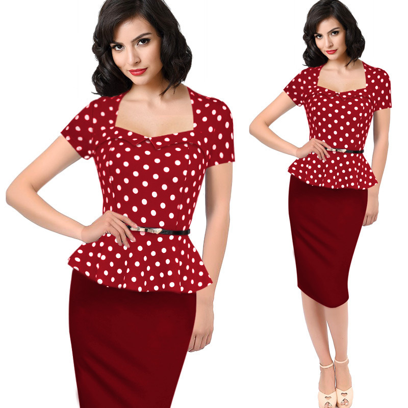 Oxiuly 2017 Summer Womens Elegant Vintage Peplum Dot Print Contrast Tunic Slim Casual Work Office Party Sheath Pencil Dress