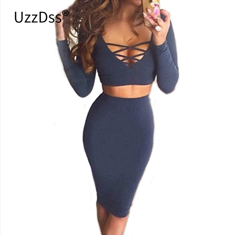 Vestidos 2017 Spring Long Sleeve Lace Up Tops 2 Piece Sets Women Sexy Clubwear Slim Midi Bandage Bodycon Outfit Party Dresses