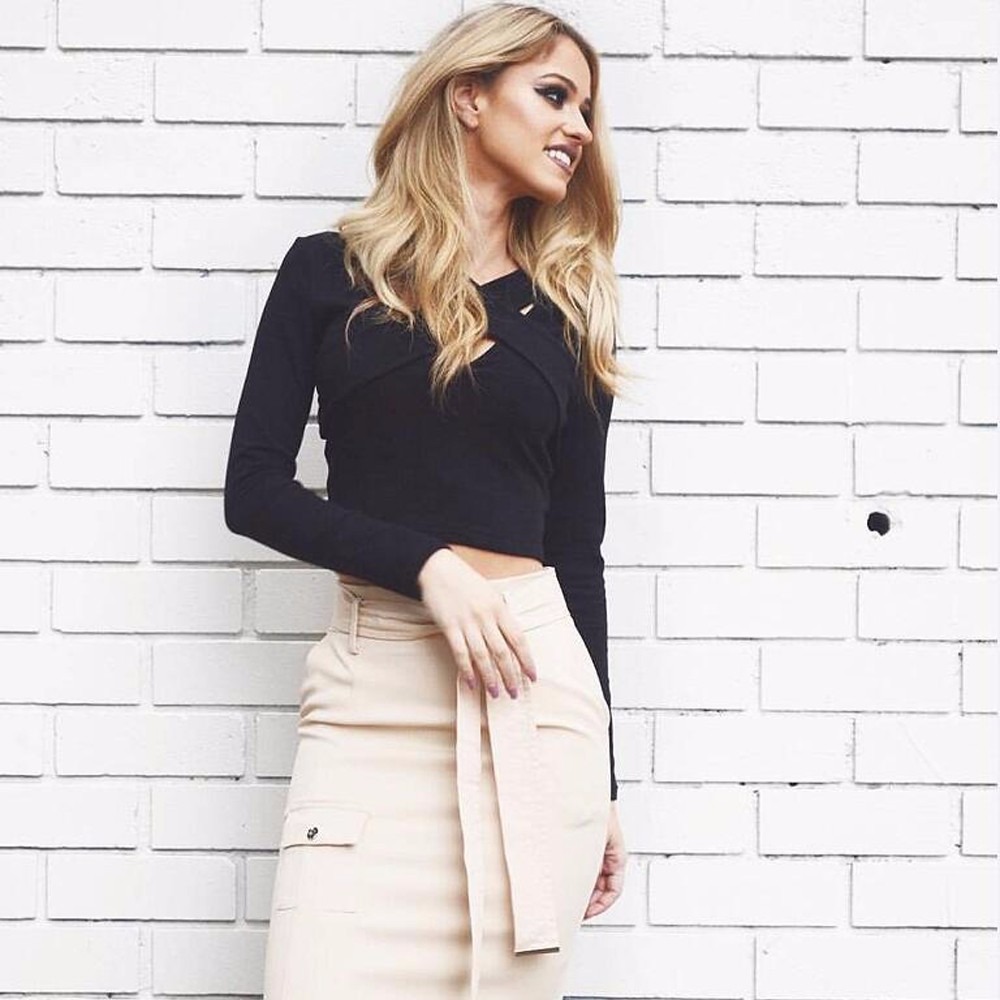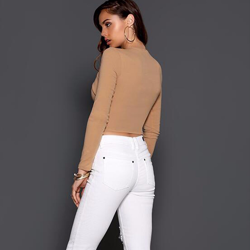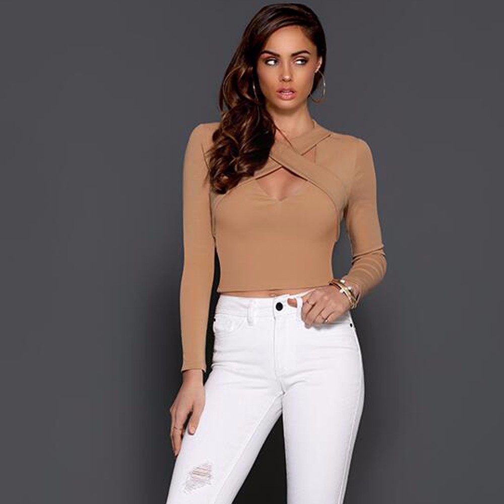Women Fashion New Sexy Cross Hollow Out Long Sleeve Autumn T Shirt Elegant Casual Slim Nightclub Crop Top Cropped Tees Shirts