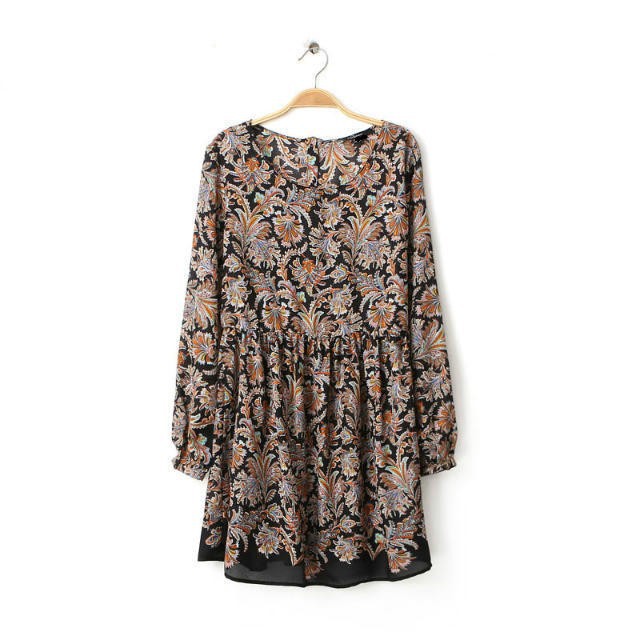 Women Vintage floral pleated mini Dress Vestido feminina O neck long sleeve casual slim brand Europen dress QZ1699