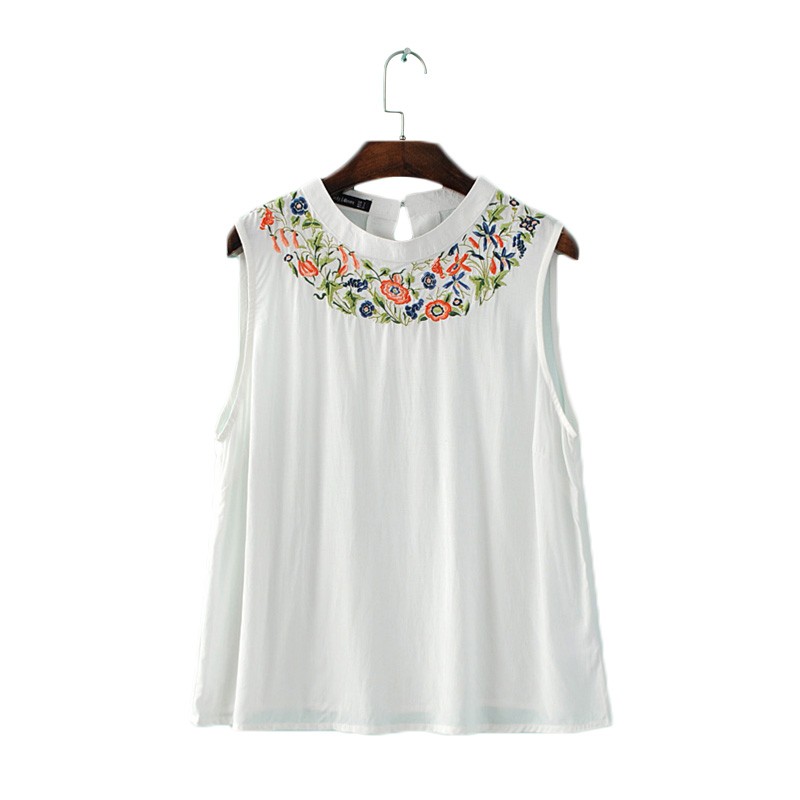 Women sweet white embroidery floral t shirt sleeveless casual summer tees camisas femininas O-neck elegant tops WT212
