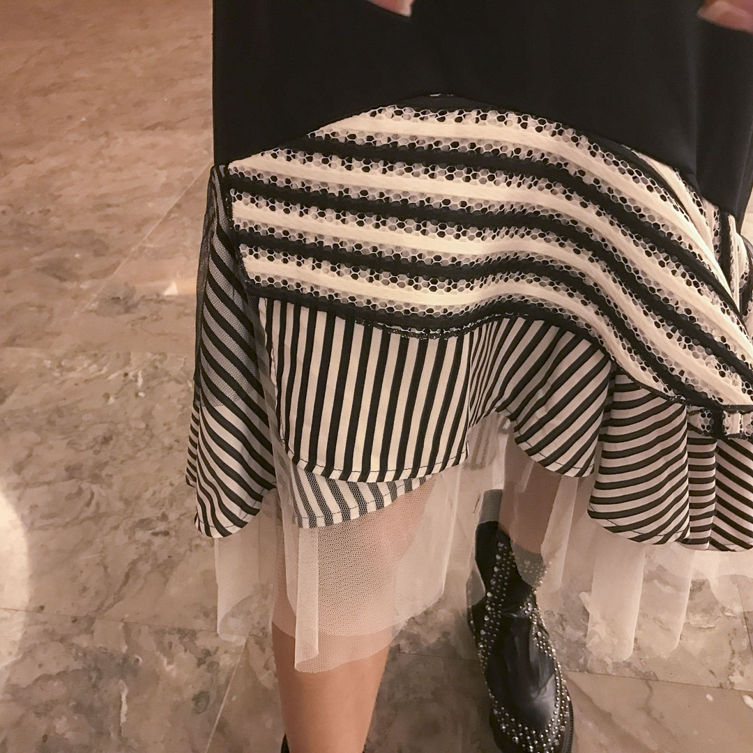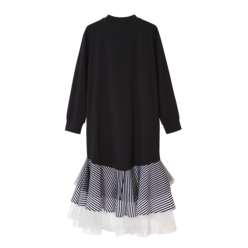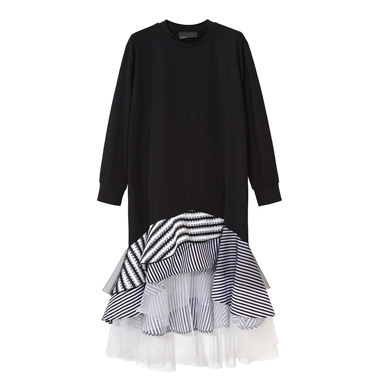 [XITAO] 2016 Street tide women splicing striped pleated hem female long sleeve Pullover ruffles O-neck knee length dress ML024