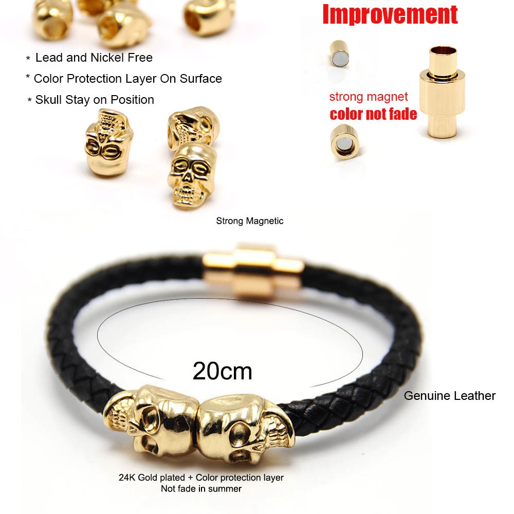 2016 Best Seller Man Bracelet Custom Size Magnetic Clasp Punk Genuine Leather Skull Bracelet for man in 10 colors