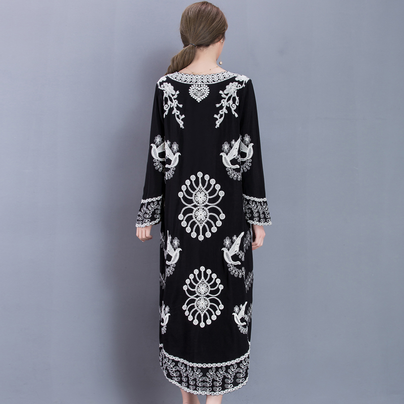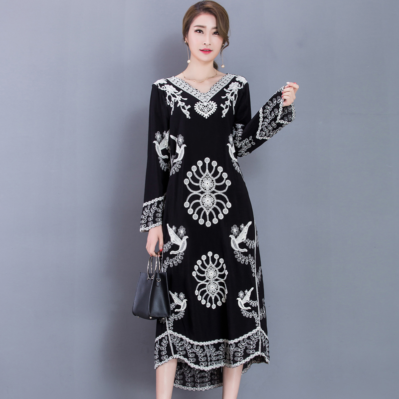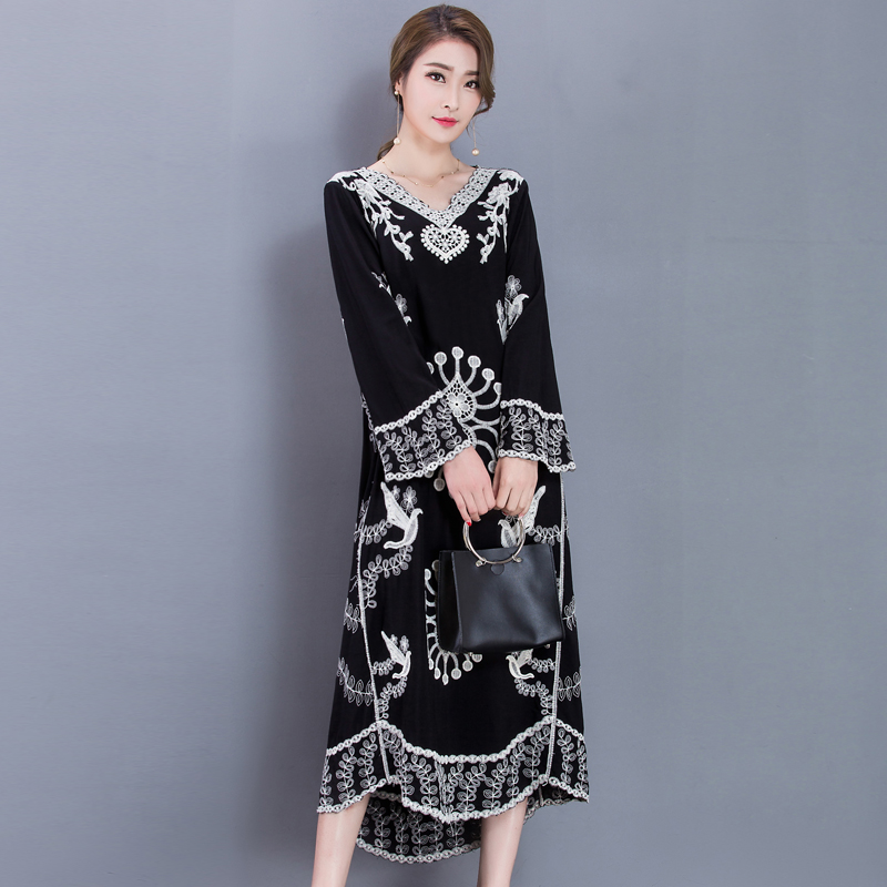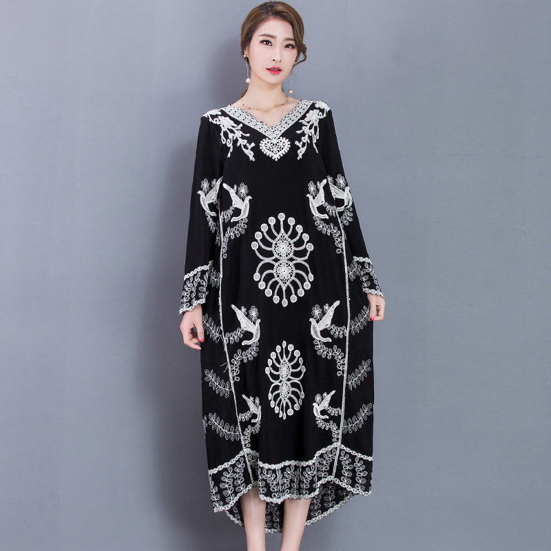 2017 Women's New Embroidery Cotton Big Size Long Dress Loose Dress Retro Black Printing Dress