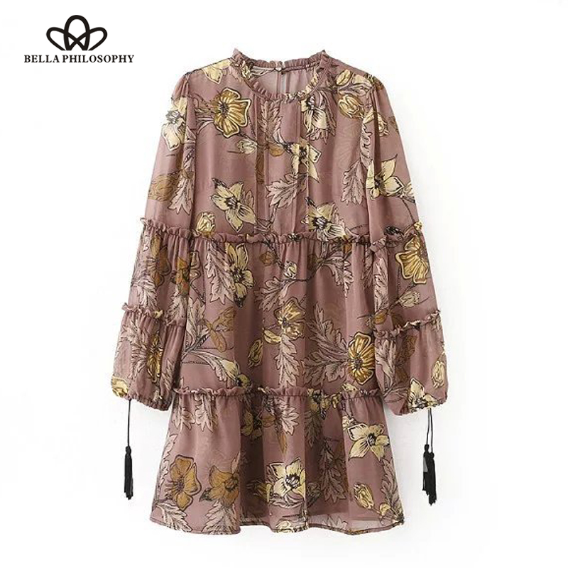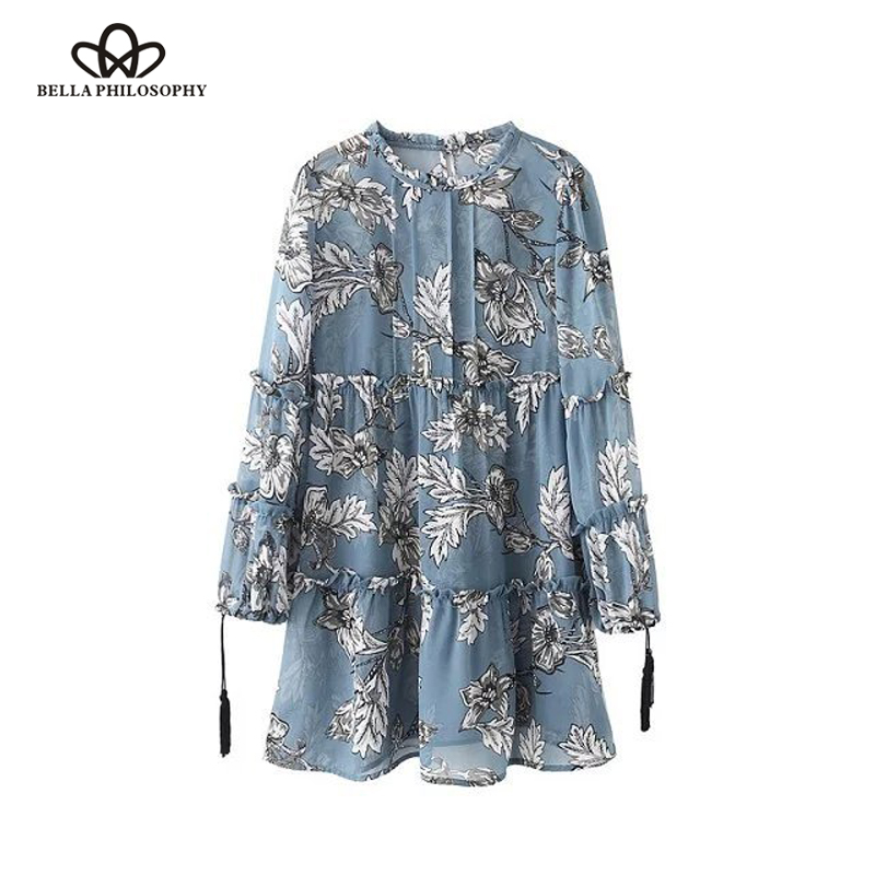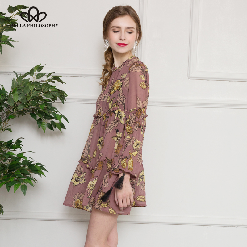 Bella Philosophy 2017 spring summer women's O-neck lantern sleeved ethnic chiffon dress floral flower print blue pink brown