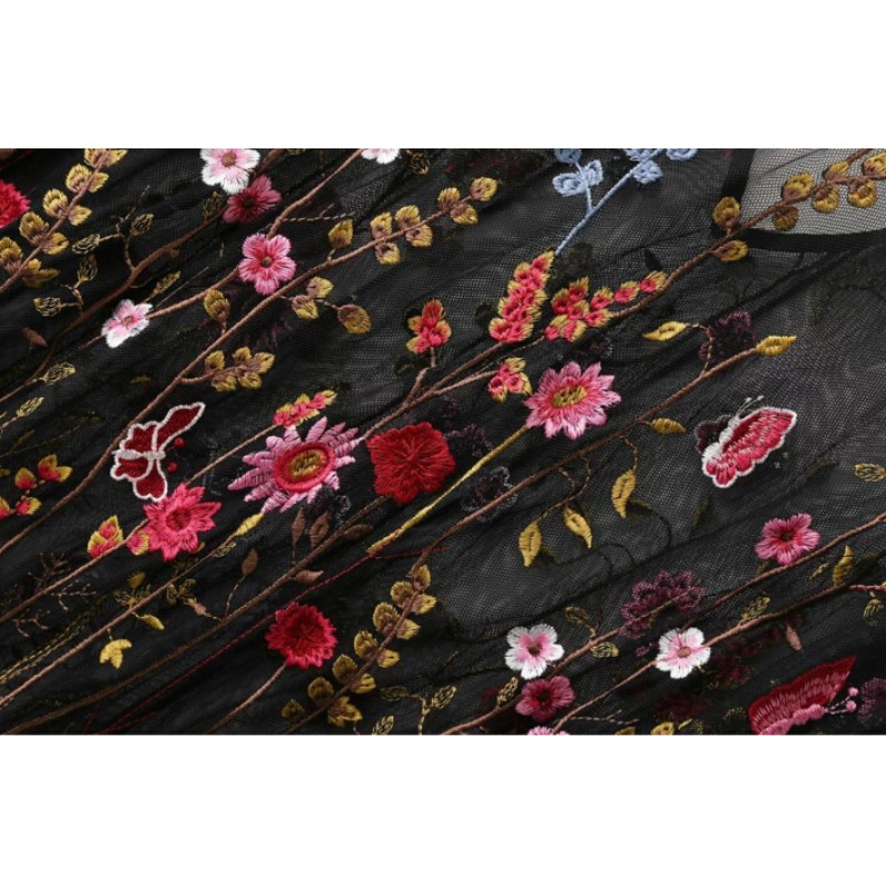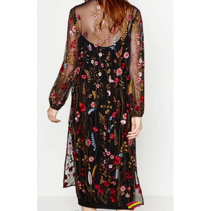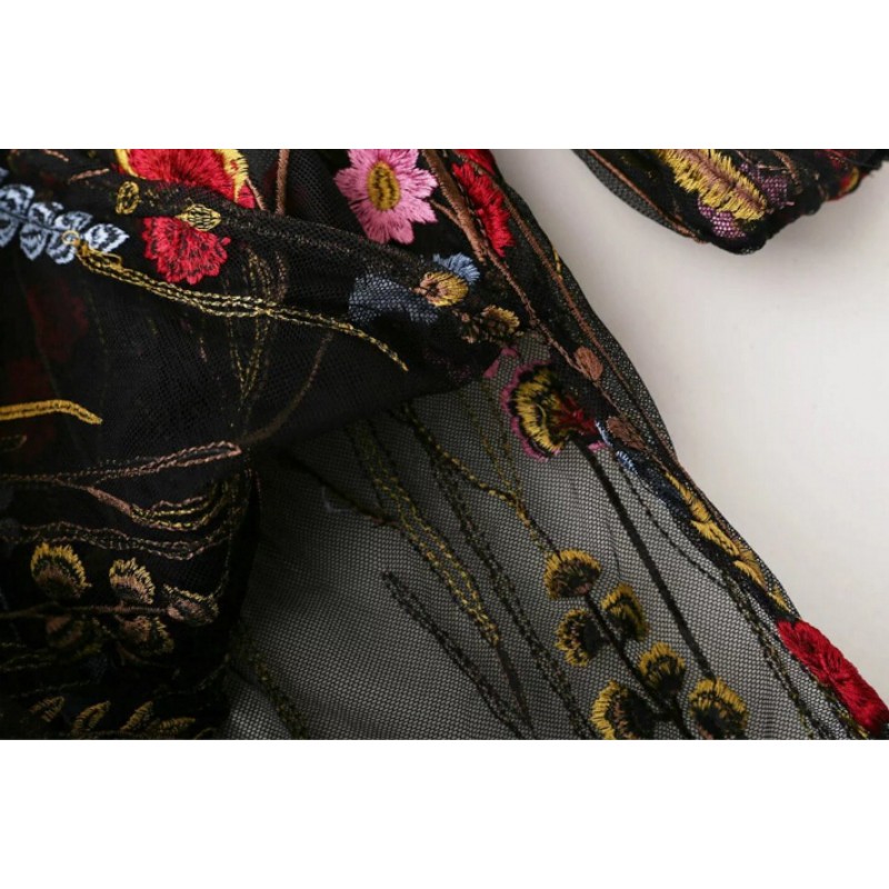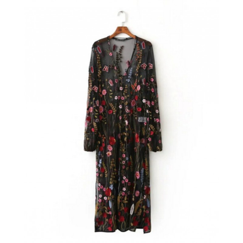 Bohemian Black color Colored Flower Embroidery Mesh Dress 2017 New Woman Fringed V neck Side Slit Long Dresses Femme