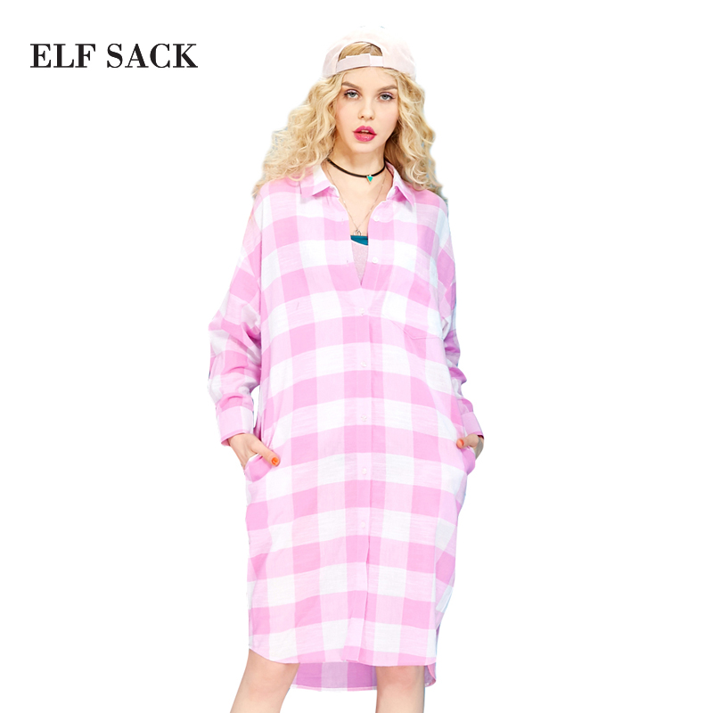 ELF SACK 2017 Spring Female Plaid Printed Literature Long Sleeve Shirt-Dresses Women Oversize Colorful Plaid Plus Size One-piece