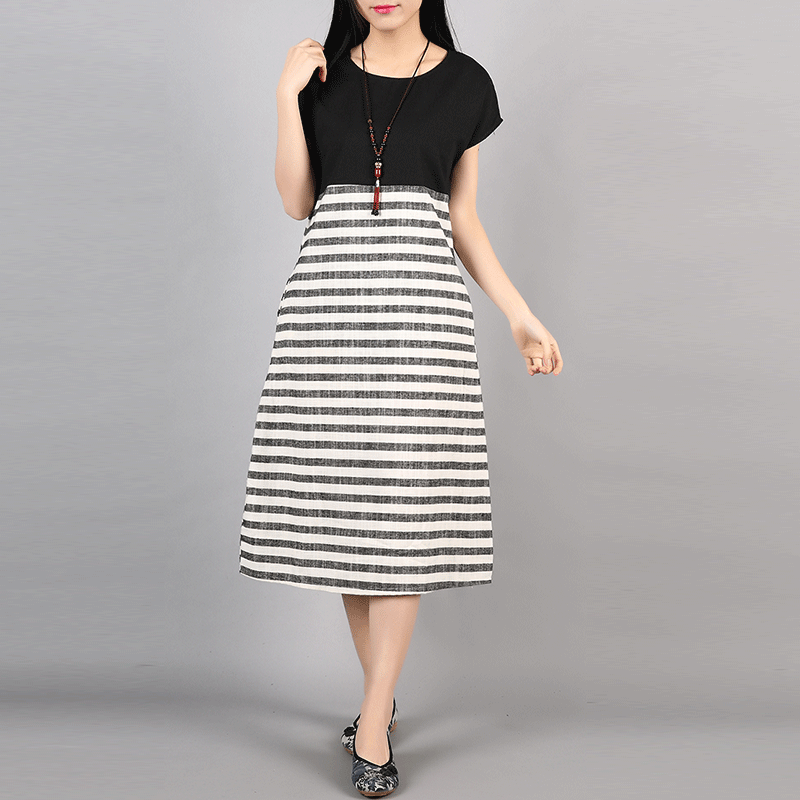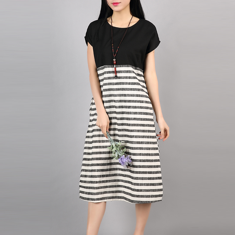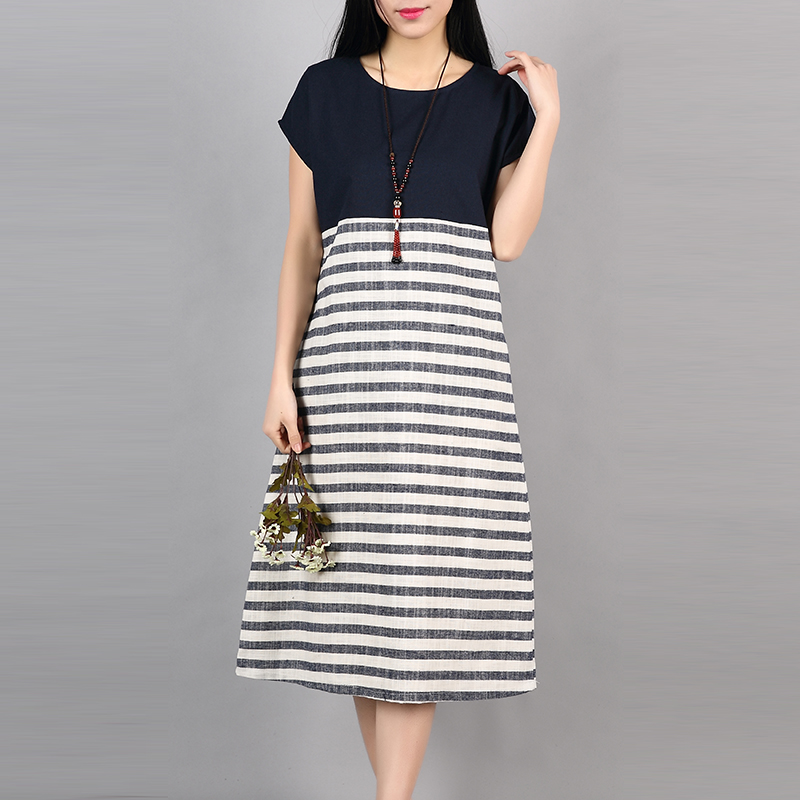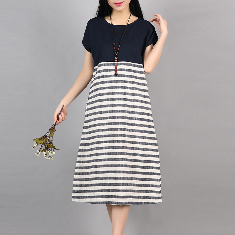 F&JE Plus Size Clothing New 2017 Spring And Summer Fashion Patchwork Striped Comfortable Cotton Linen Women Casual Dresses J135