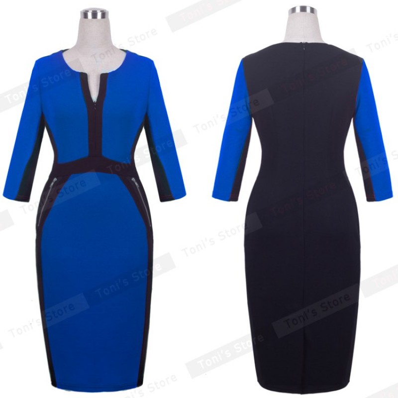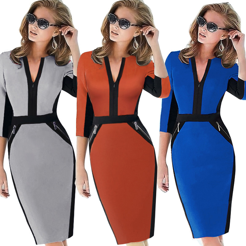 Nice-forever Office Women Zipper special New Arrival Plus Size fashion patchwork V neck formal work bodycon Midi dress 837