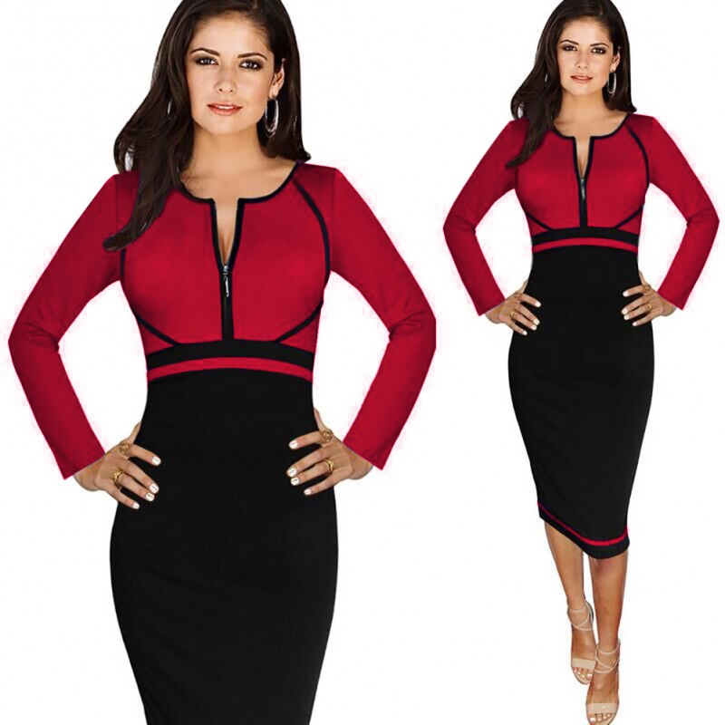 Oxiuly Womens Elegant Colorblock Front Zipper Full Sleeve Wear to Work Business Casual Office Party Sheath Pencil Bodycon Dress