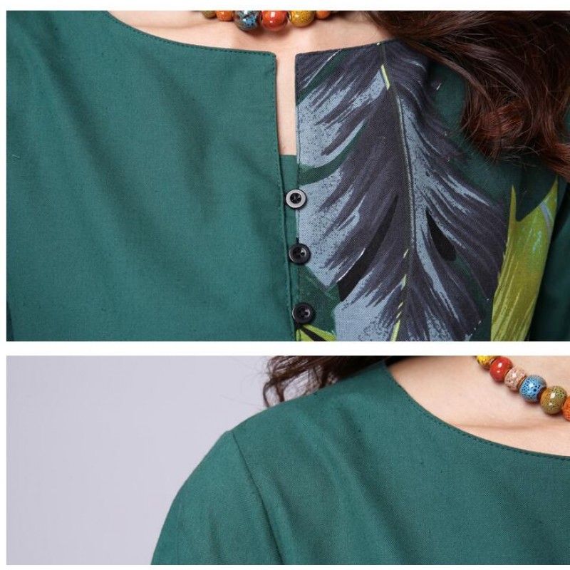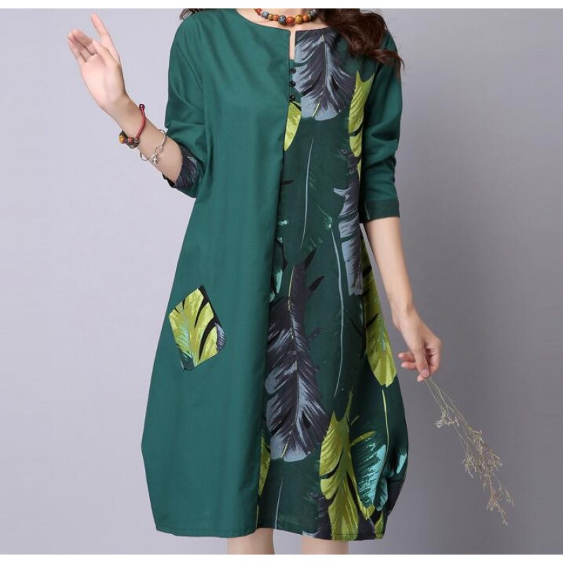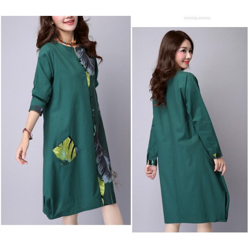 Patchwork Leaves Print Long Sleeve Dress Fashion Vintage 2016 cottonlinen Loose casual Women Dresses Party Femme Dress
