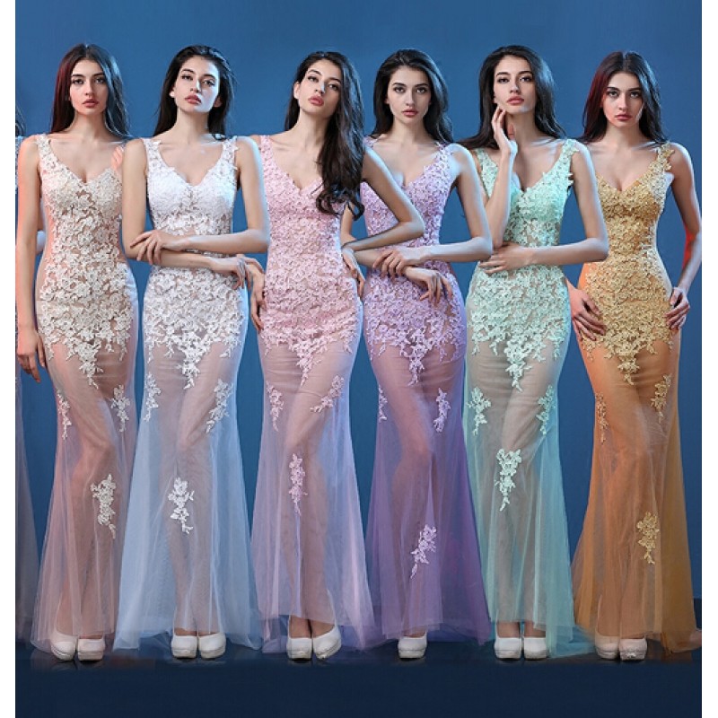 Plus Size 10 Color Lace Long Dress Nightclub Dresses Clairvoyant Women Slim Fish Tail Sexy Long Train V-Neck Design Party Wear