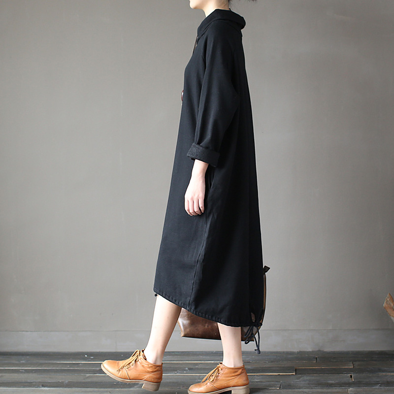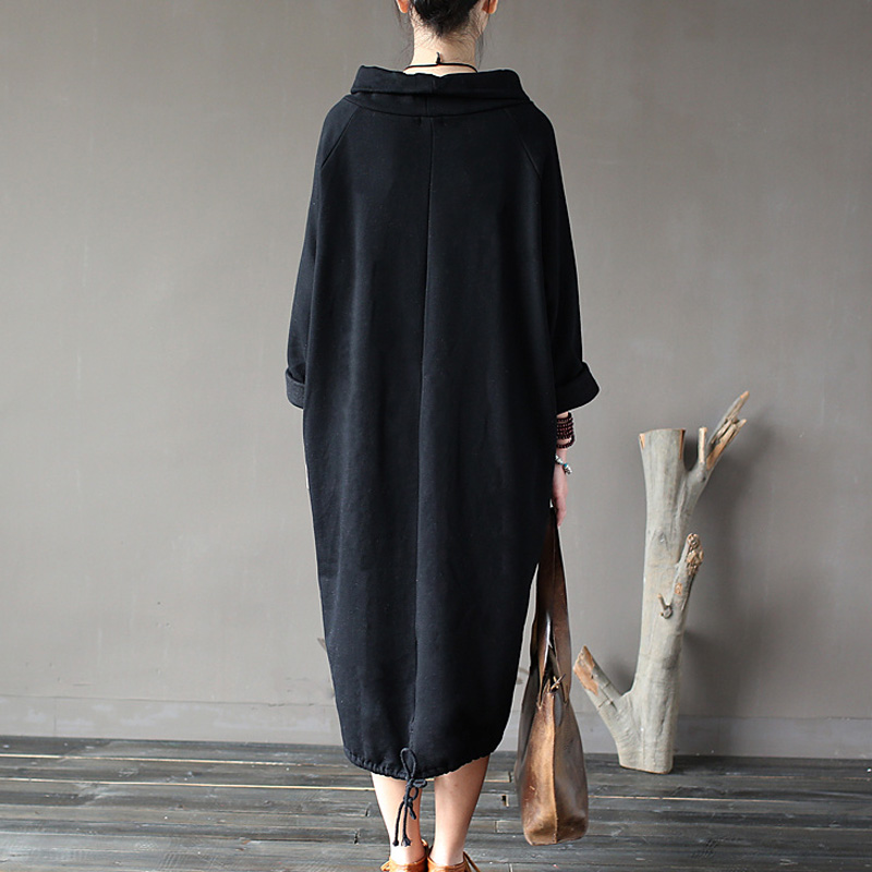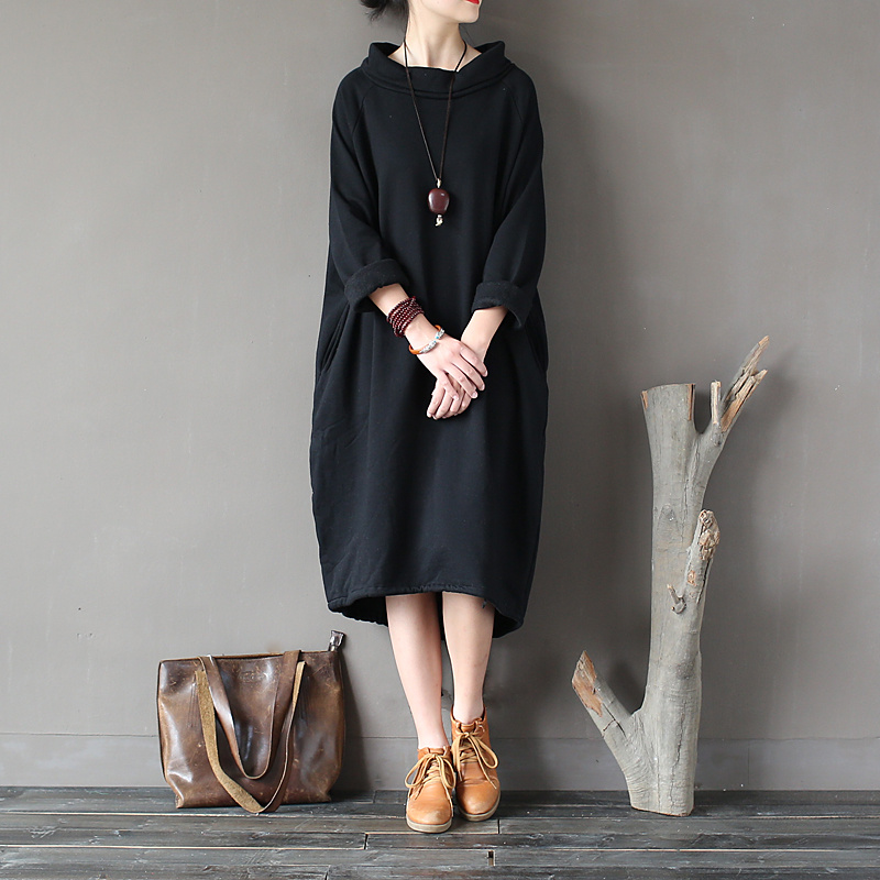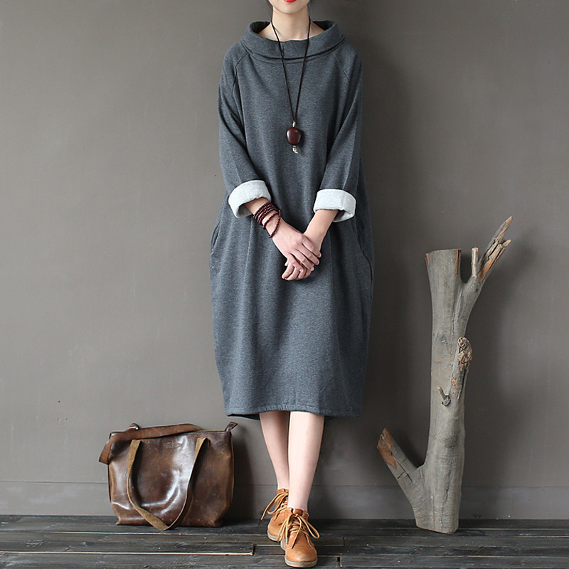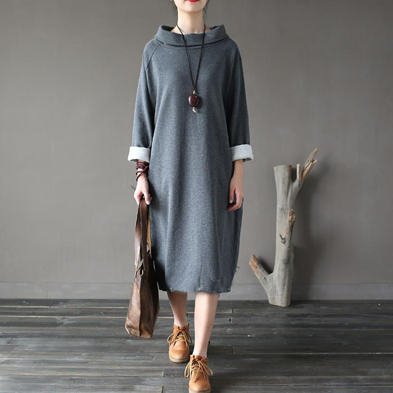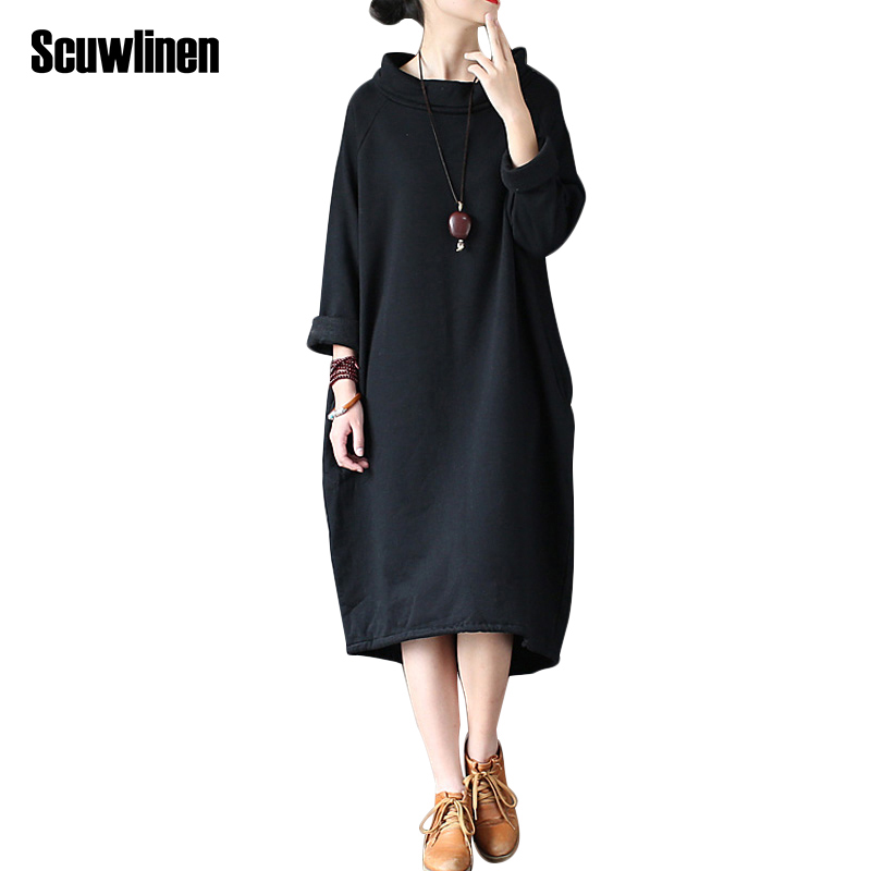 SCUWLINEN 2018 Spring Autumn Dress 100% Cotton Women Dress Vestidos Loose Fleece Thickening Turtleneck Long-sleeve Long Robe S60