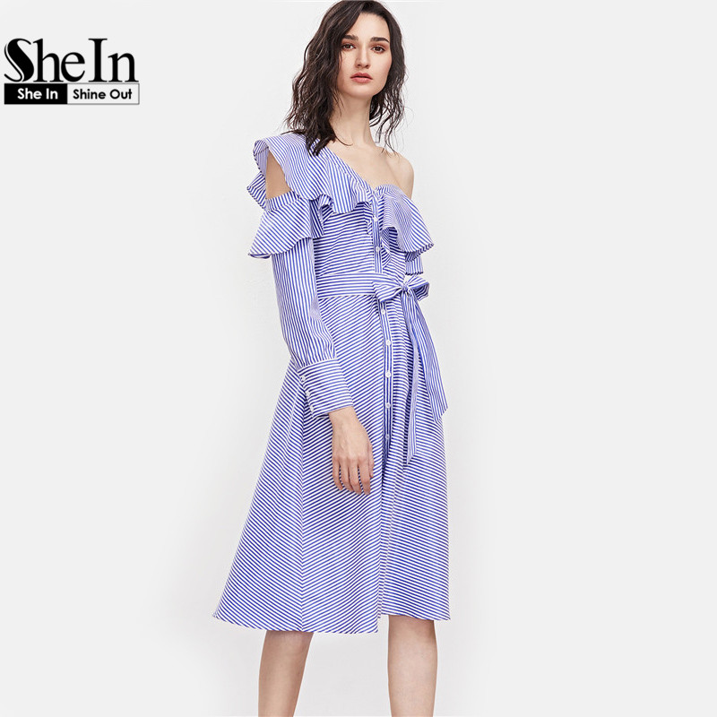 SheIn Blue Striped Asymmetric Ruffle Off The Shoulder Belted Shirt Dress Womens Long Sleeve Knee Length A Line Dress
