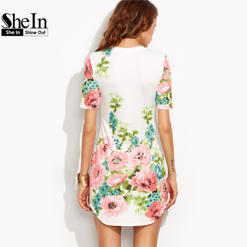 SheIn Elegant Dresses For Woman Summer Style Ladies Multicolor Floral Print Round Neck Short Sleeve Bodycon Dress