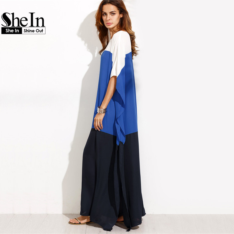 SheIn Summer Beach Dresses Casual Women Loose Dress Multicolor Round Neck Half Sleeve Color Block Split Maxi Dress