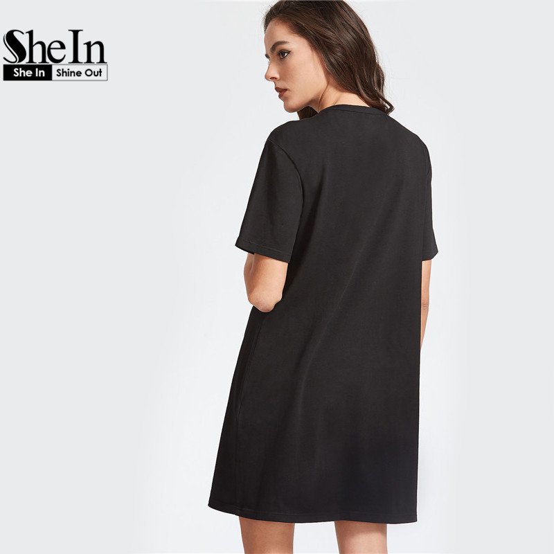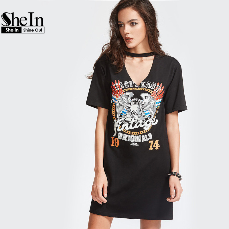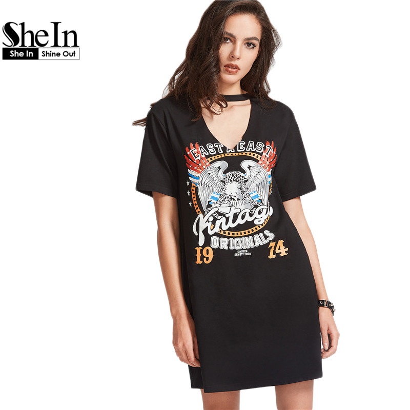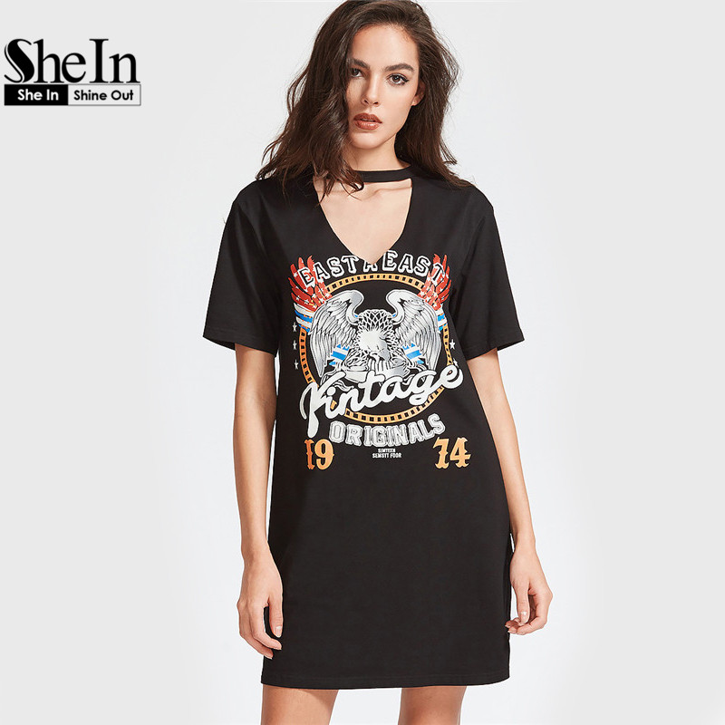 SheIn Women Summer Dresses Black Graphic Print Cut Out V Neck Tee Dress Ladies Short Sleeve Shift T-shirt Dress