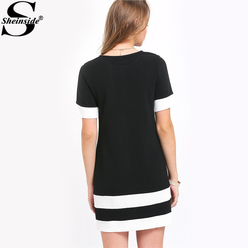 Sheinside Ladies Color Block Casual Mini Dresses New Summer Style Black White Patchwork Crew Neck Short Sleeve Shift Dress