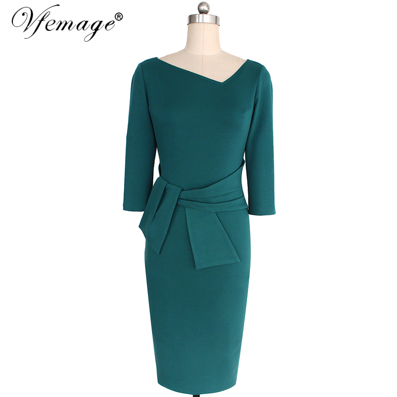 VfEmage Womens Asymmetric Neck Elegant Belted Tunic Wear to Work Office Business Bodycon Stretch Fitted Sheath Pencil Dress 4430
