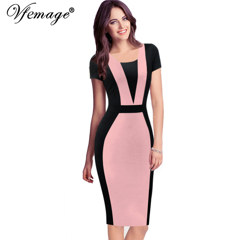 Vfemage Womens Elegant Optical Illusion Colorblock Contrast Modest Slim Work Business Casual Party Sheath Pencil Dress 2138