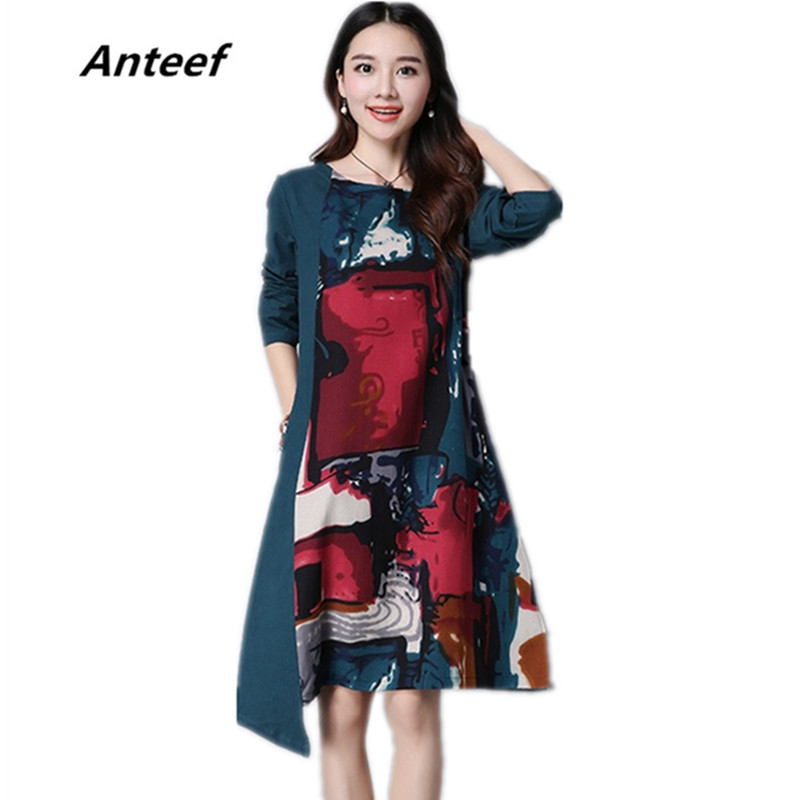Anteef cotton linen vintage print plus size women casual loose long summer tank dress vestidos femininos 2018 two piece dressesUSD 14.97-15.97/piece