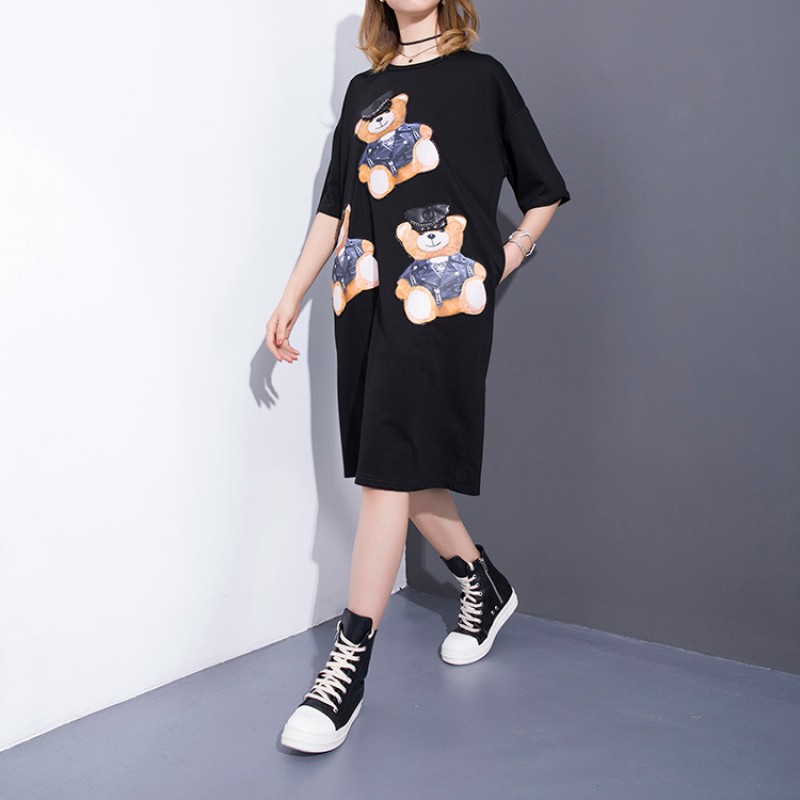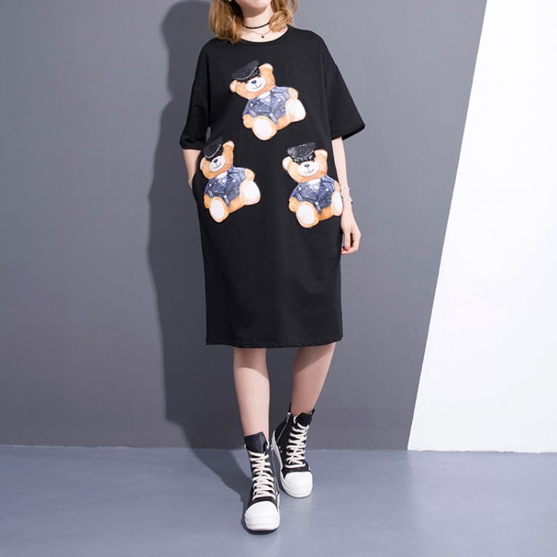 2017 Spring Summer Fashion New Black Bear Printing O Neck Dress Korean Loose Pocket Dresses Big Size Woman T38601