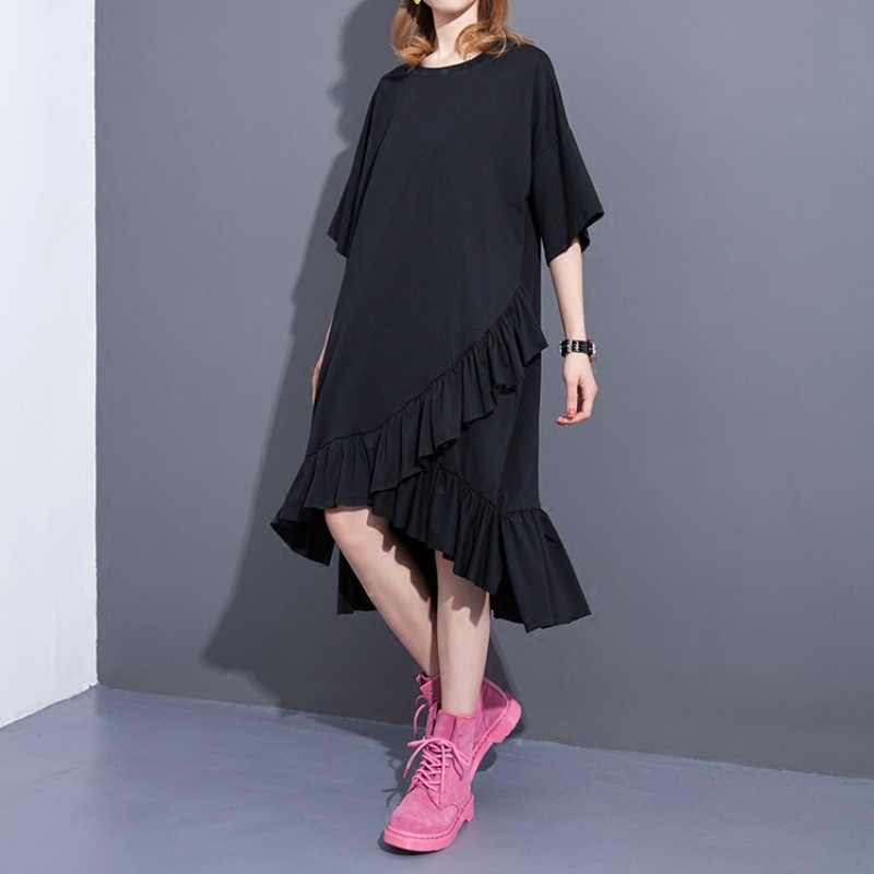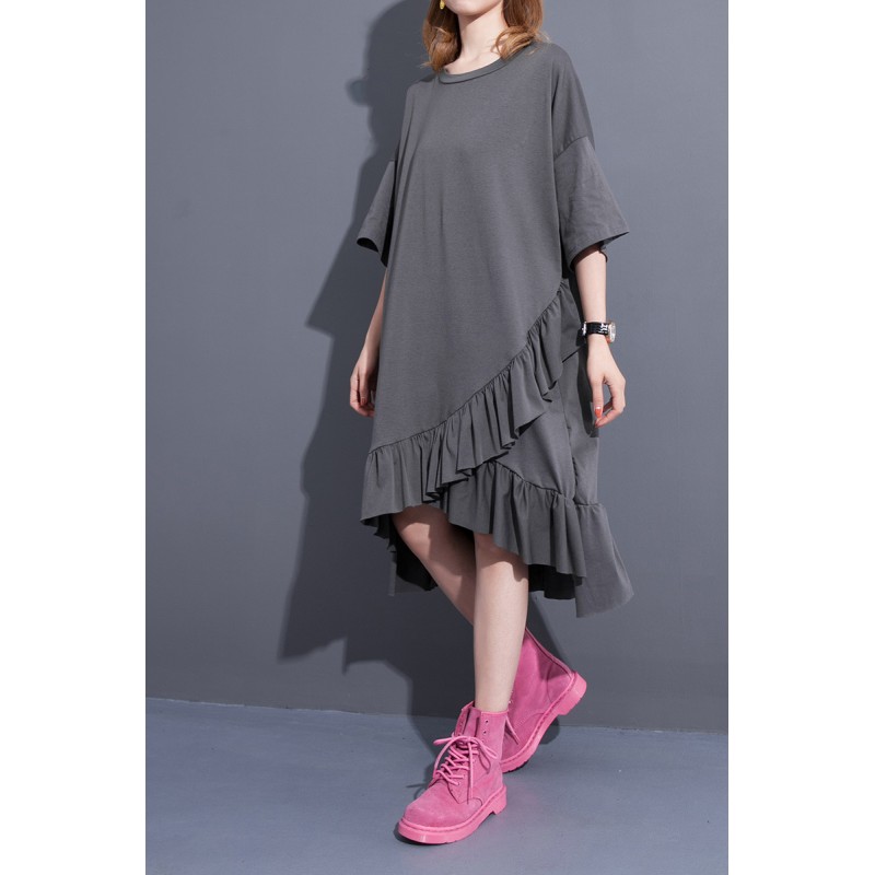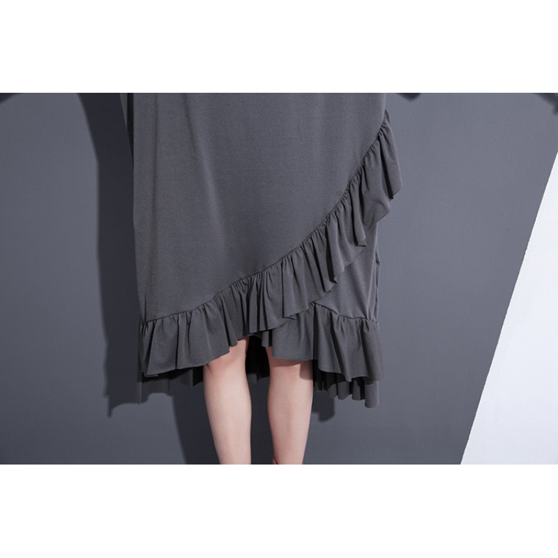 2017 Spring Summer Fashion New Black Grey Solid Color O Neck Dress Loose Cascading Ruffles Dresses Big Size Woman T37201