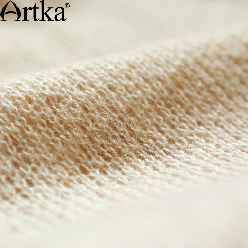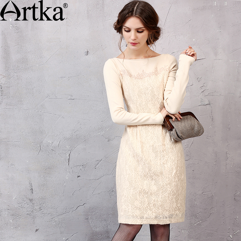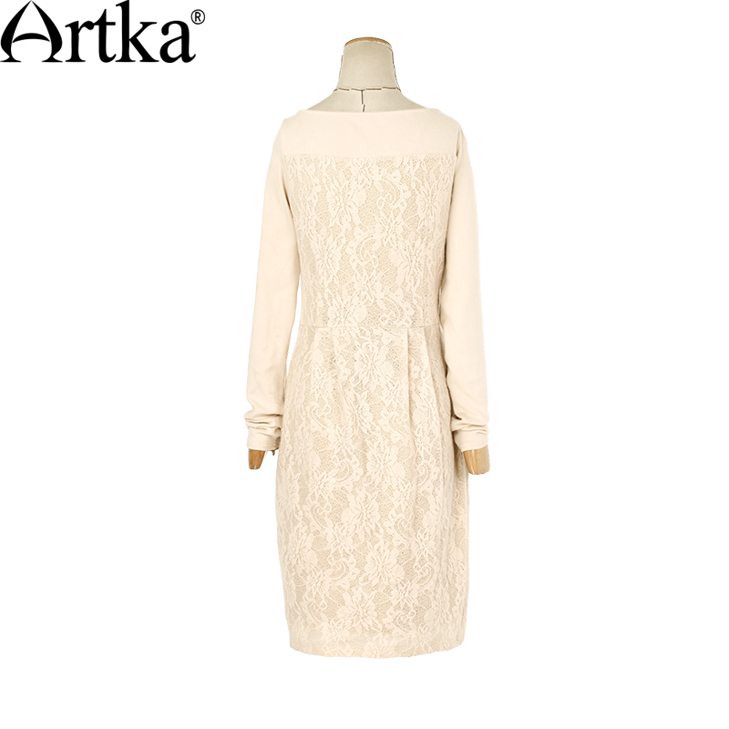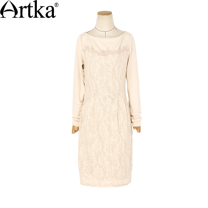 Artka Women's Autumn New Solid Color Knitting&Lace Patchwork Embroidery Dress Slash Neck Long Sleeve Slim Fit Dress LA11151Q