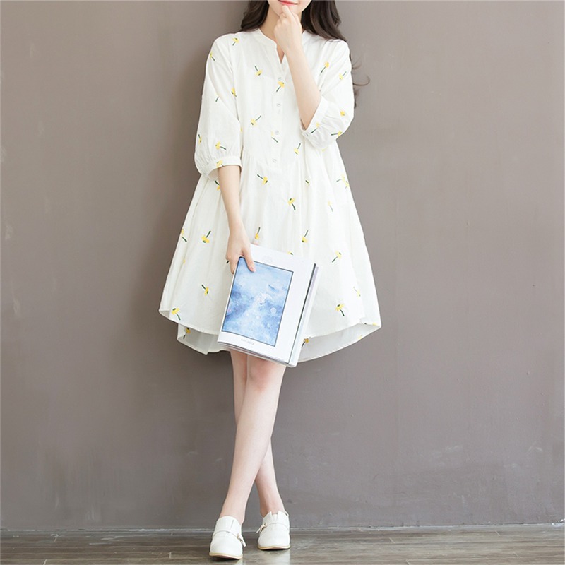 Autumn Dress White Color Embroidery Flower Plus Size Women Dress V Neck Cotton Lolita Dress vestido Size S-3XL