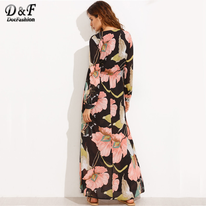 Dotfashion Summer Beach Maxi Dresses Long Elegant Boho Wear Multicolor Floral Print V Neck Split Side Long Sleeve Maxi Dress