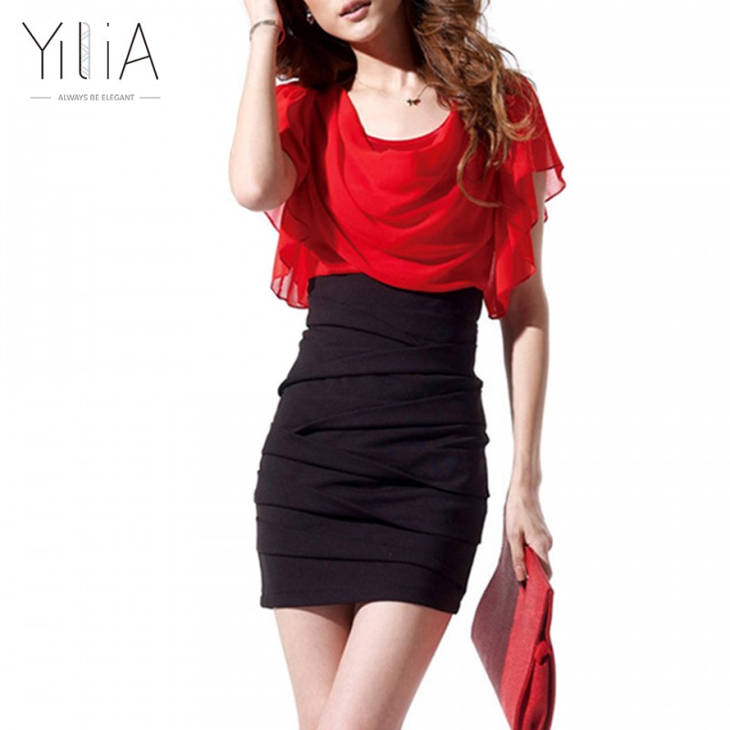 Dress Chiffon Women Elegant White Red Black Color Block Short Sleeve Pleated 2017 Cowl Neck Patchwork Ruched Summer Office Dress