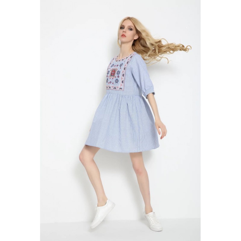 European 2017 Dress Women Folk Retro Style Stripe Floral Embroidery Casual Loose Vintage Lantern Sleeve Pleated Short Dress